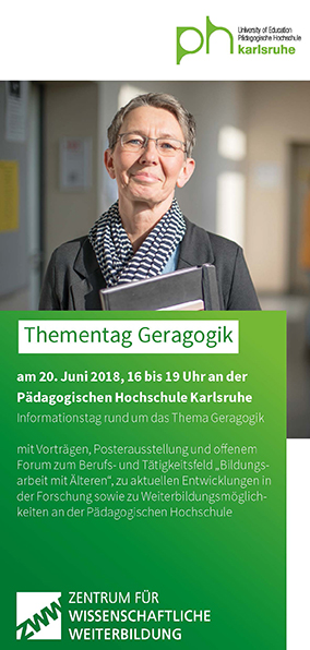 Das Zentrum für wissenschaftliche Weiterbildung der Pädagogischen Hochschule Karlsruhe lädt für Mittwoch, 20. Juni, von 16 bis 19 Uhr zum Themen- und Infotag „Geragogik“ ein. Der Geragogiktag ermöglicht Einblicke in das Arbeits- und Tätigkeitsfeld „Bildungsarbeit mit Älteren“ und informiert zu aktuellen Entwicklungen in der Forschung sowie zu Weiterbildungsmöglichkeiten an der Pädagogischen Hochschule Karlsruhe. Auf dem Programm stehen unter anderem Impulsvorträge zu den Themen „Sexualität im Alter", „Wohnen und Mobilität im Alter" und „Mitbestimmung im Alter".