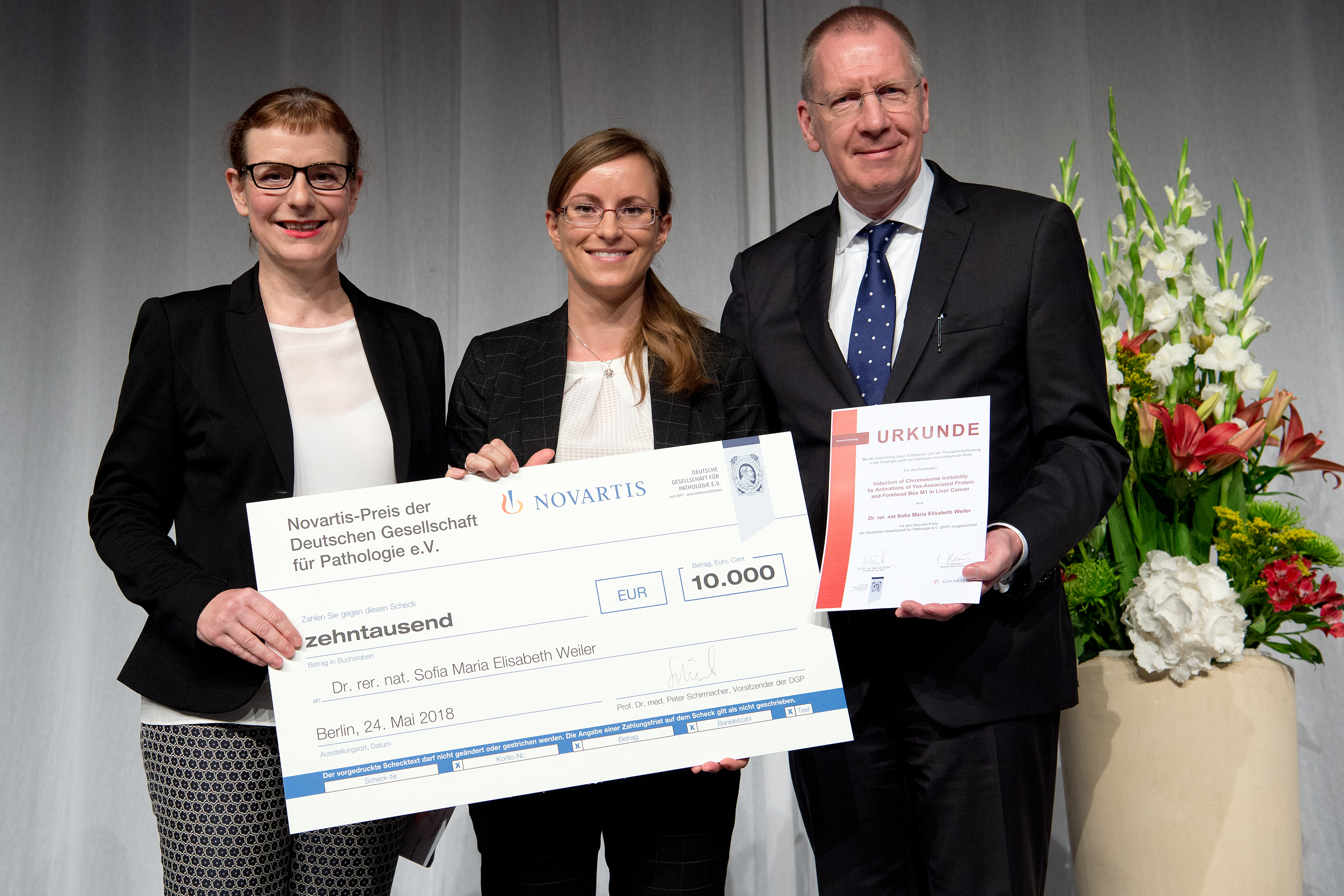 Nürnberg/Berlin, 25. Mai 2018 – Bereits zum vierten Mal fördert die Deutsche Gesellschaft für Pathologie (DGP) mit dem Novartis-Forscherpreis herausragende grundlagenorientierte und translationale Forschungsarbeiten zur Pathogenese und Diagnostik von Erkrankungen. Der diesjährige Preis wurde im Rahmen der Eröffnungsveranstaltung der DGP-Jahrestagung in Berlin verliehen.