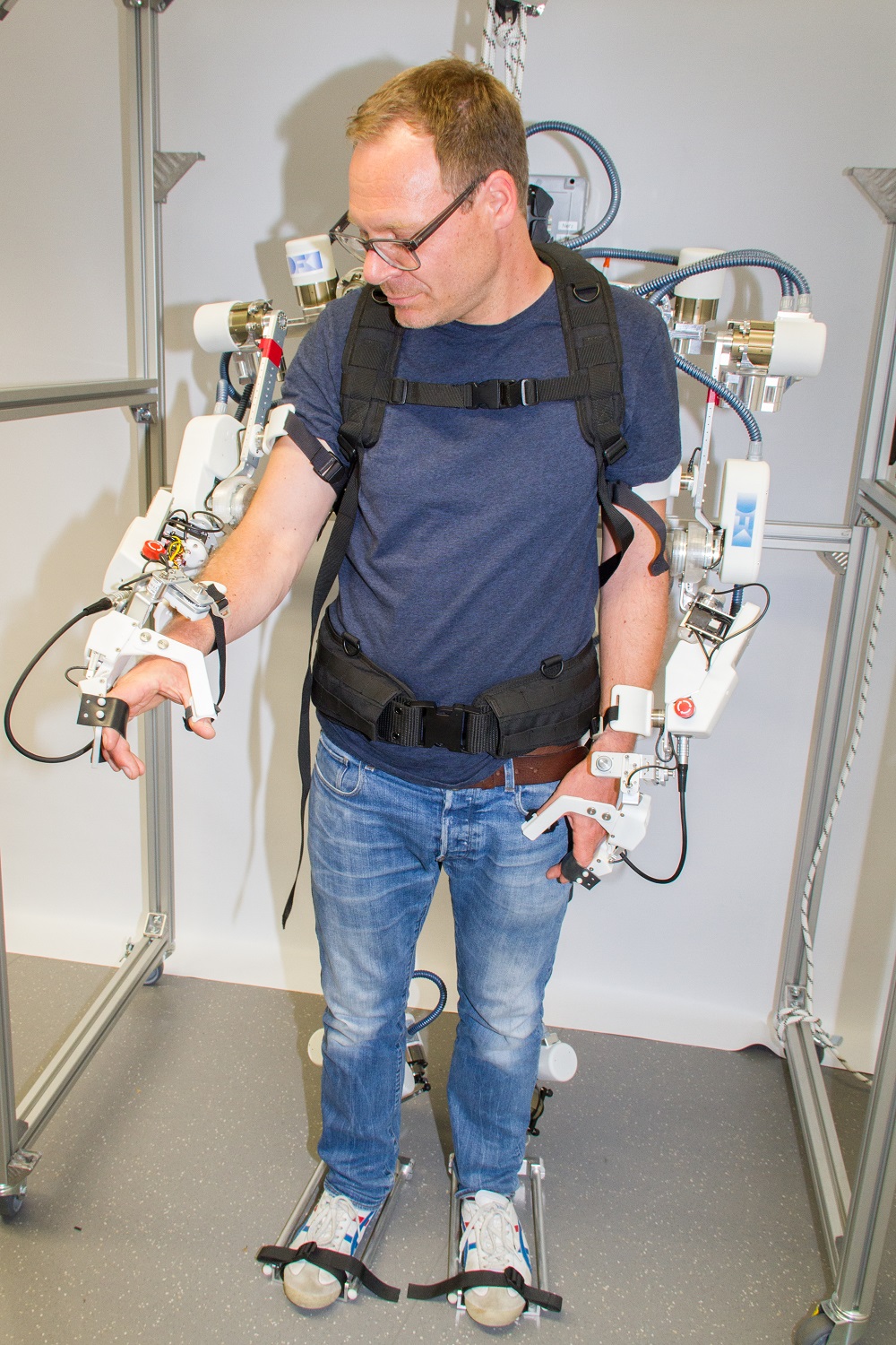 Das entwickelte Ganzkörper-Exoskelett erfasst kinematisch annähernd den gesamten Bewegungsraum des menschlichen Körpers. Die Oberkörperkonstruktion dient dabei der Rehabilitation, die von der flexiblen Beinkonstruktion getragen wird. Im Gegensatz dazu trägt sich das Teilsystem nicht selbst, sondern ist an einem Rollstuhl befestigt. Zum Aufbau der Exoskelette erarbeitete das Forscherteam innovative Methoden im Leichtbau sowie in der Antriebstechnologie und Regelungstechnik. Die mechatronischen Ansätze kombinierten sie mit einem neuen System zur Online-Auswertung von Elektroenzephalografie- und Elektromyografie-Signalen (EEG-/EMG-Signalen), wodurch eine Einschätzung des Zustands des Patienten sowie eine mehrstufige Unterstützung der Regelung möglich ist. Der Verbundpartner rehaworks GmbH betrachtete im Rahmen des Projekts die Anforderungen an medizinische Geräte und evaluierte dahingehend kontinuierlich die Systeme.