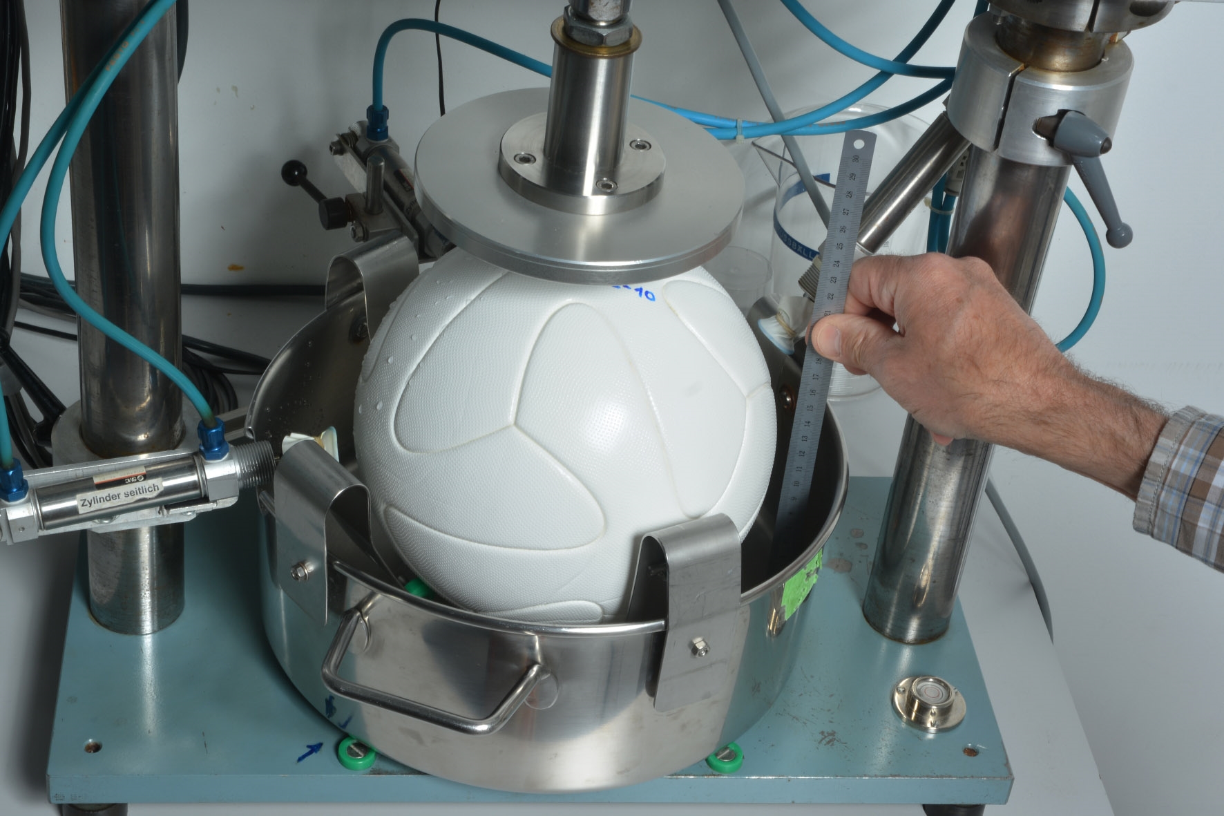 On behalf of FIFA, Empa has been conducting the incorruptible series of tests on footballs striving for the FIFA quality program's seal of approval for 22 years. Not every ball passes the test. It is not only the circumference and weight of the ball that are measured precisely. In addition, despite being crushed 250 times in a water tank, it may only absorb a minimal amount of liquid, must be able to hold its air and always jump off at the same height when it impacts from a height of two meters. To prove that it is a perfect sphere, the ball is also measured at no less than 4’000 points. And finally, the ball must retain its shape even if shot against a steel wall 2’000 times at 50 kilometers per hour.