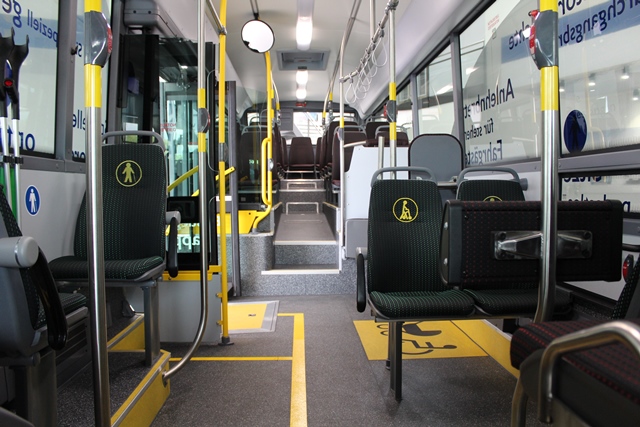 Eine wesentliche Neuerung besteht darin, dass neben der mittleren auch die vordere Tür mit einer Klapprampe ausgestattet ist. Die vordere Eingangstür und der vordere Gangbereich sind breiter. Menschen mit Rollator können deshalb jetzt auch vorne einsteigen. Es besteht direkter Kontakt mit dem Busfahrer. Er nimmt die Personen wahr und weiß, dass sie mehr Zeit benötigen könnten. Auch der Fahrkartenkauf kann direkt erfolgen, ohne dass man wie bisher von der mittleren Tür erst nach vorne muss. Im Fahrgastraum befinden sich spezielle Abstellplätze für Rollatoren, direkt daneben können sich die Menschen setzen. Zwei Sitzplätze sind erhöht und erleichtern so das Hinsetzen und Aufstehen. Auf dem Boden weisen deutlich sichtbare gelbe Markierungen den Weg. Die Sitze sind aufgrund der aufgedruckten Symbole leicht identifizierbar. Ebenfalls gelb markiert sind die Haltestangen an den Türen vorne und in der Mitte des Busses. Die optische Hervorhebung der Haltestangen fokussiert sich auf wenige relevante Stellen im Ein- und Ausstiegsbereich. Dies erleichtert die Orientierung und Informationsverarbeitung. An der Seitenwand sind Halterungen für Gehhilfen angebracht.