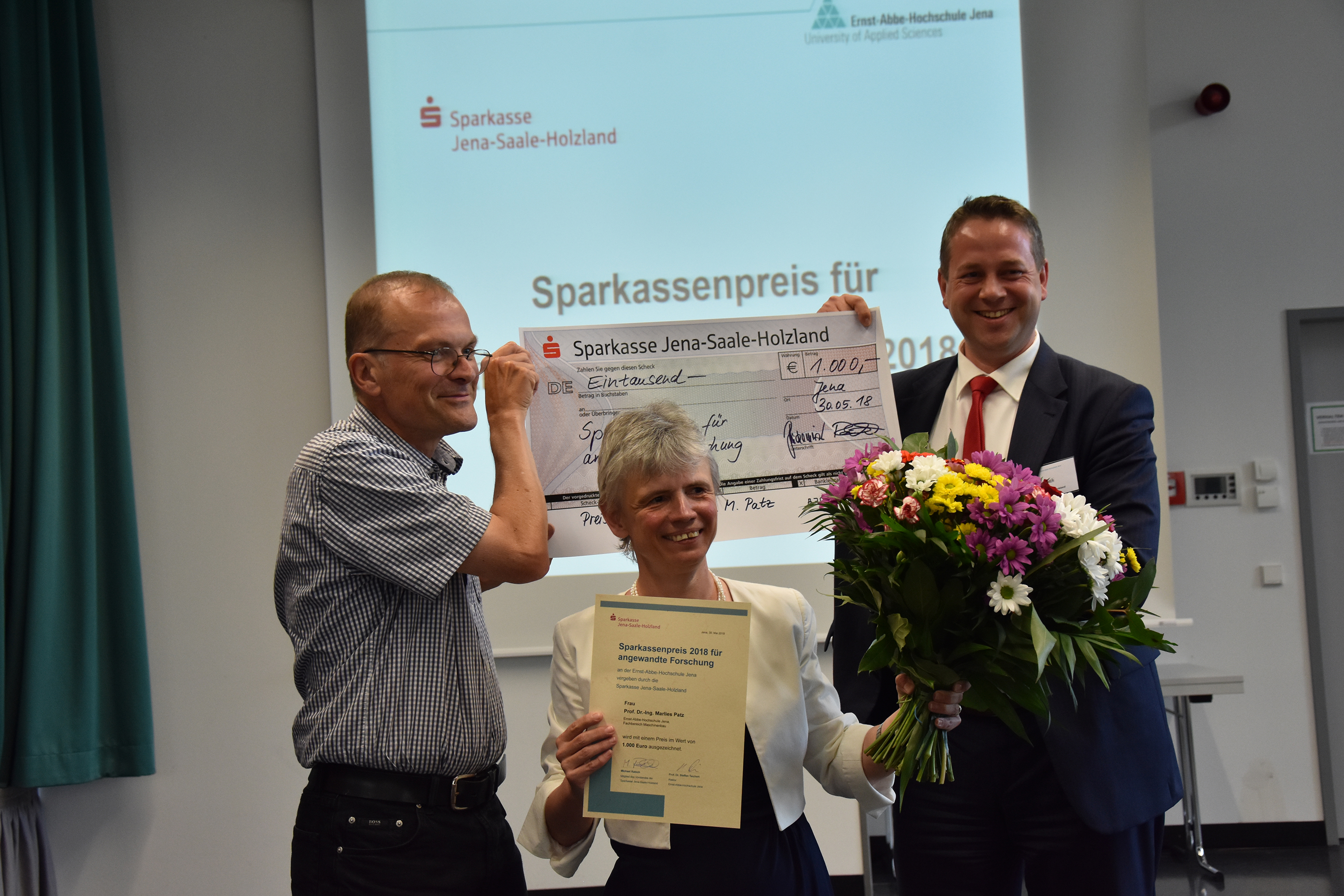 Mit dem Sparkassenpreis für angewandte Forschung und 1.000 € wurde die Ingenieurin Prof. Dr. Marlies Patz ausgezeichnet. Auch sie ist seit dem Jahr 2009 Lehrende an der Jenaer Hochschule. Die Geräte- und Fertigungstechnikerin ist für das Gebiet „Fertigungstechnik und -automatisierung“ im Fachbereich Maschinenbau zuständig. Ihr Studium und die Promotion schloss sie, ebenso wie ihre Kollegin Kraußlach, an der Friedrich-Schiller-Universität Jena ab. Danach war sie als wissenschaftliche Mitarbeiterin und schließlich stellvertretende Geschäftsführerin bei der Gesellschaft für Fertigungstechnik und Entwicklung in Schmalkalden tätig. Seit ihrer Berufung als Professorin führt Marlies Patz sehr erfolgreich Projekte im Bereich der wirtschaftsnahen Forschung und Entwicklung durch.