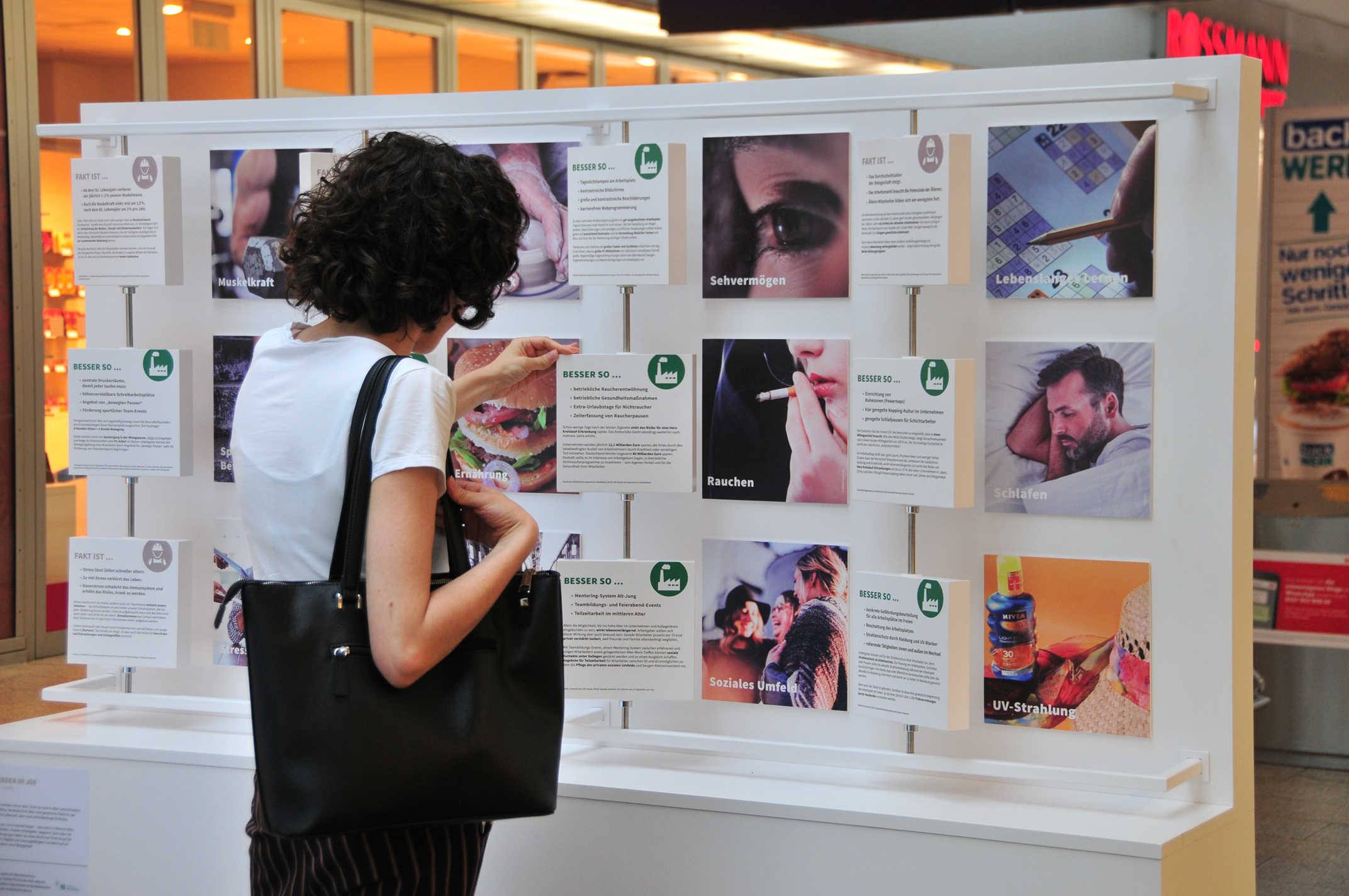 Auf den 12 Drehscheiben des Exponats werden jeweils beide Seiten der Einflussfaktoren aus der Arbeitnehmer- und Unternehmenssicht beleuchtet, und erstaunliche Fakten zum Altern präsentiert. Hätten sie gewusst, dass, wer wenig schläft, auch früher tot ist, da die optimale Schlafdauer von 7 bis 8 Stunden pro Nacht von knapp einem Drittel der Deutschen nicht eingehalten wird, tägliche Soft-Drinks das Leben um mehr als 4 Jahre verkürzen und sitzen das neue Rauchen ist?