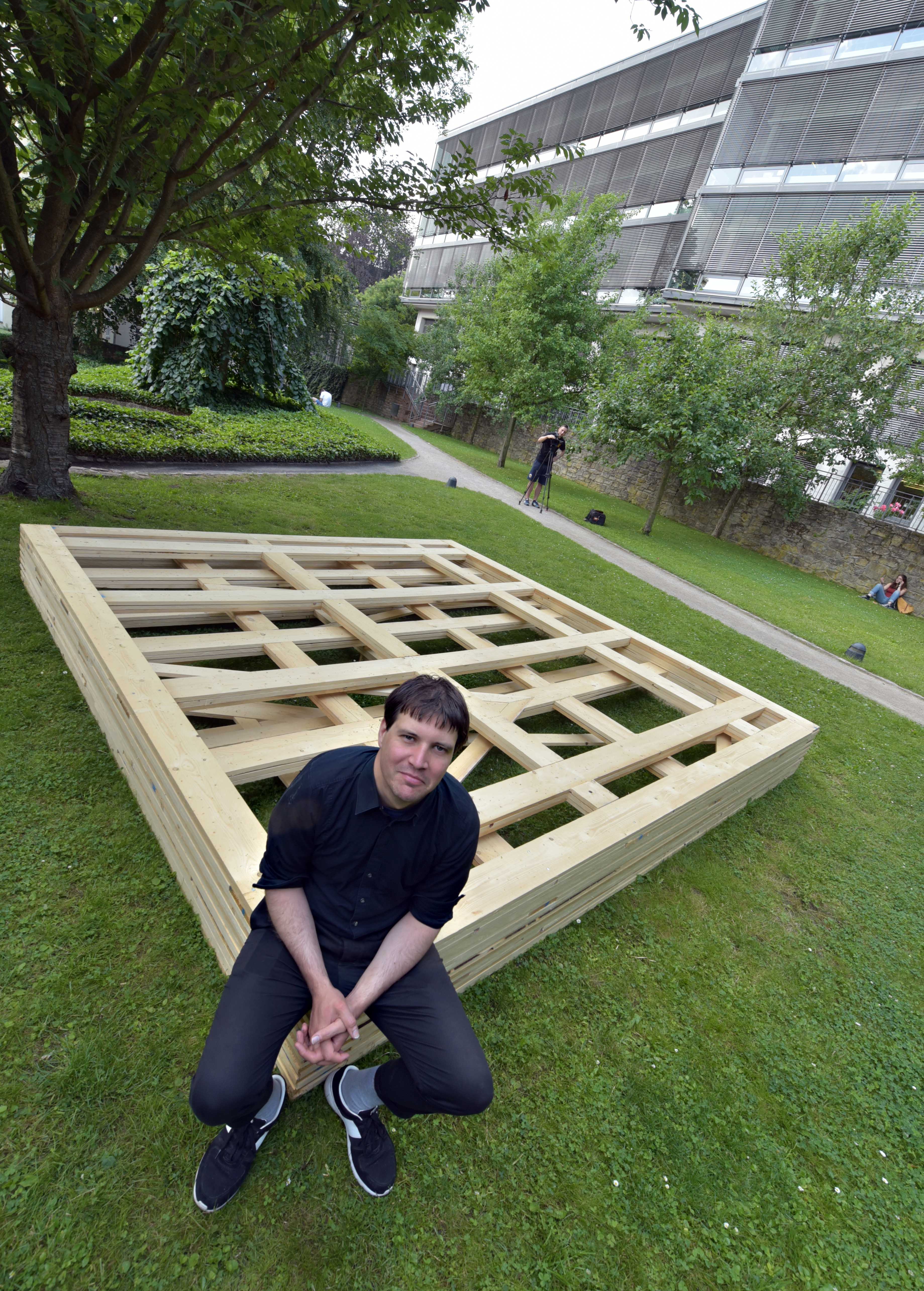 Zwei mehrere Meter lange Rechtecke aus schlichten Holzbalken sind die Grundlage der beiden Kunstwerke, die der Bildhauer Marten Schech eigens für den diesjährigen „FrommannschenSkulpturenGarten“ angefertigt hat. Sie sind wie Bilderrahmen auf die grüne Wiese des Gartens gelegt. Das Innere der Rahmen gestaltet Schech mit weiteren Holzbalken aus, die sich zu einem Muster aus Fachwerkkonstruktionen zusammenfügen. In den Zwischenräumen wird das Gras zur grünen Farbfläche, die im Laufe der Ausstellung wächst und dadurch stetig die Werke verändert.