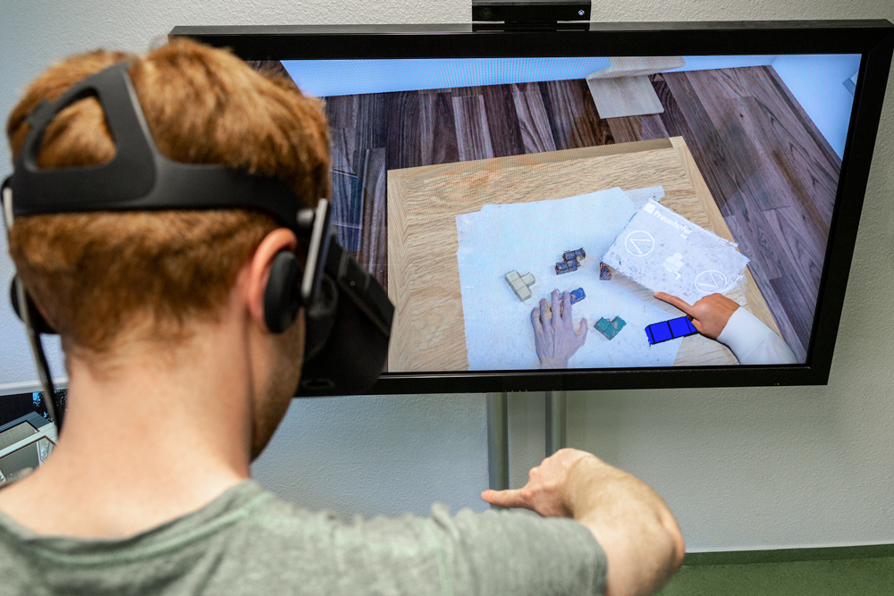 Am Fraunhofer-Stand auf der CeBIT können Besucher sich an einem 3D-Puzzle probieren und sich Hilfe aus der virtuellen Welt holen. In der Demo wird dem VR-Nutzer das reale Objekt live in die VR-Umgebung projiziert und erläutert. Er kann dann virtuell darauf reagieren und diese Reaktionen in die reale Situation zurückspiegeln.
