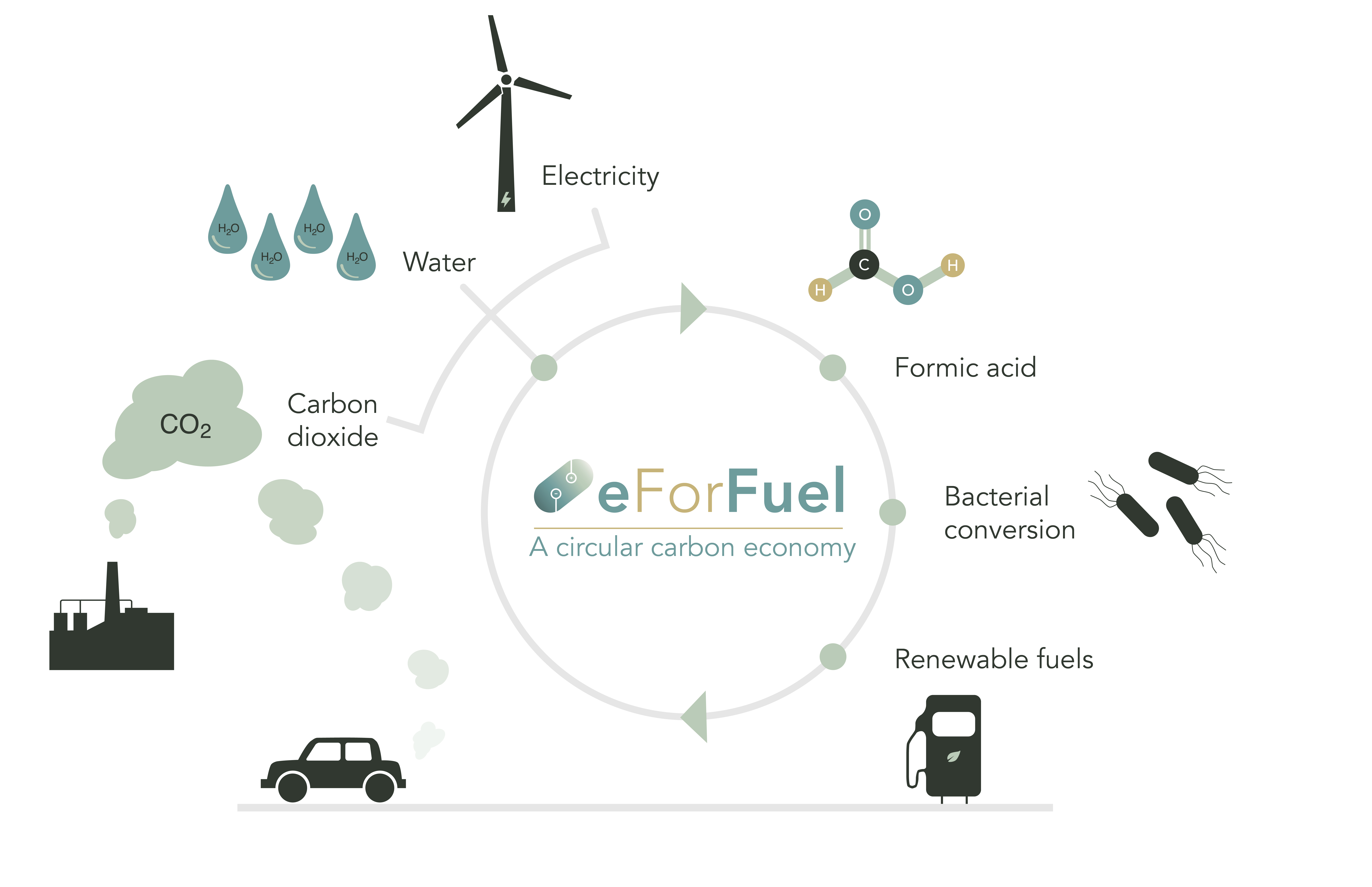 eForFuel aims to establish and demonstrate a unique integrated electro-bioreactor, which automatically integrates CO2 electro-reduction, formate production and formate bioconversion to hydrocarbons that can serve as "drop in" fuels. This integrated system will serve as a stepping-stone towards transforming the way we produce fuels and carbon-based chemicals.
