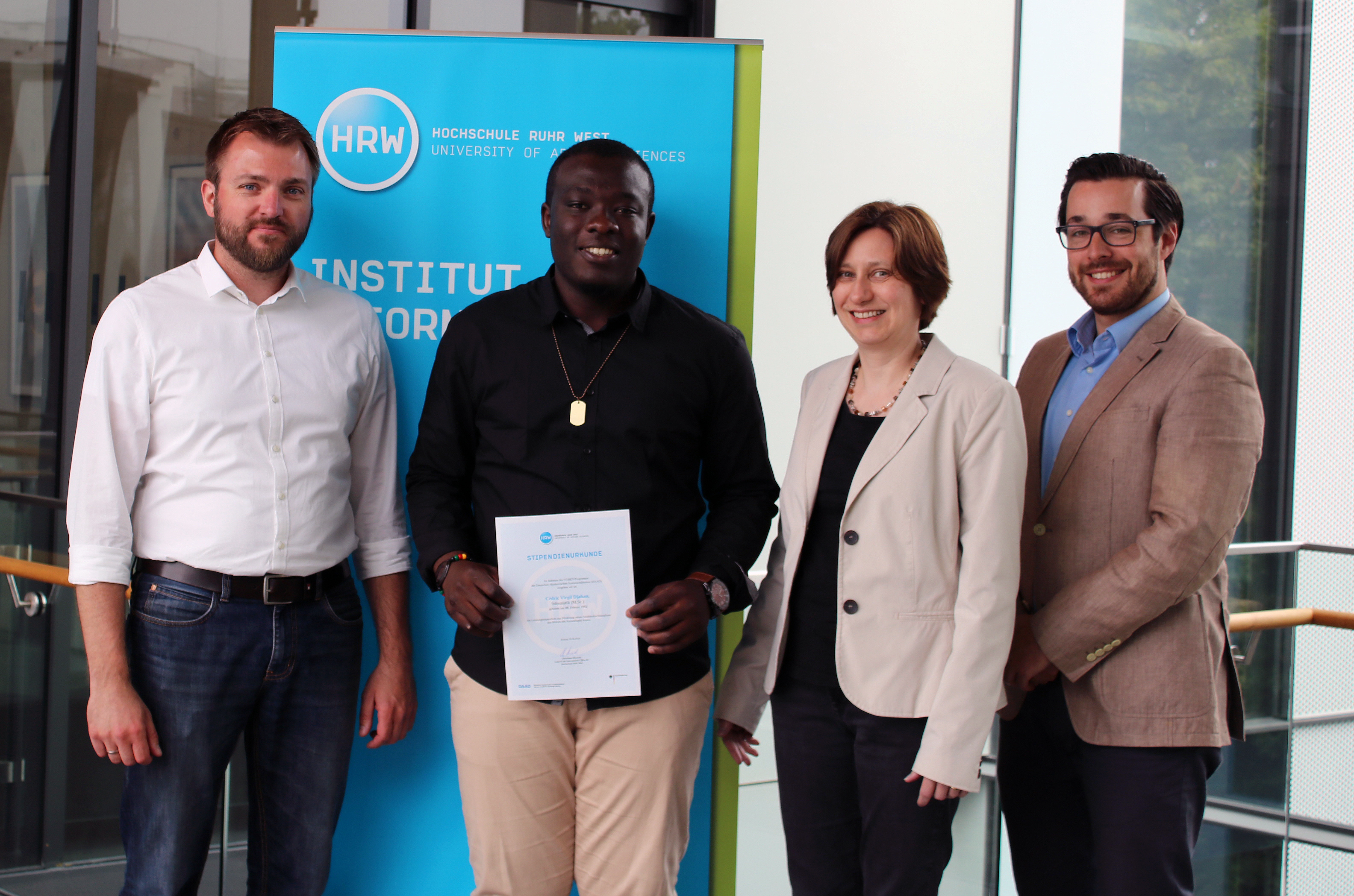 „Ich freue mich sehr, dass Cédric Djahan an der HRW Informatik studiert“, sagte Studiengangsleiter Prof. Dr. Marc Jansen anlässlich der Stipendienverleihung. „Als familiäre Hochschule bieten wir optimale Studienbedingungen und Dank kleiner Kursgrößen können wir die Studierenden individuell fördern.“