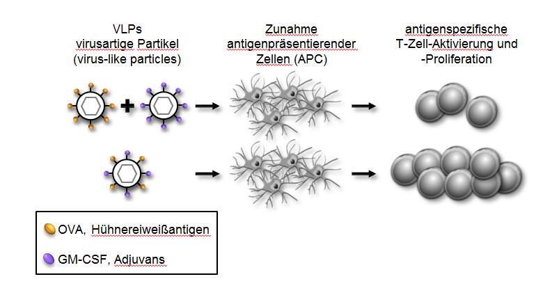 Als Modell-Antigen nutzten die PEI-Forscher Hühnereiweiß (Ovalbumin), als Adjuvans GM-CSF (granulocyte macrophage-colony stimulating factor, Granulozyten-Monozyten-Kolonie-stimulierender Faktor). Der Rezeptor für dieses Zytokin findet sich auf verschiedenen Immunzellen, die das Antigen weiteren Immunzellen präsentieren und so eine Immunantwort auslösen. Über verschiedene experimentelle Ansätze wiesen die Forscher nach, dass diese modularen VLPs wichtige Immunzellen (T-Helferzellen und zytotoxische T-Zellen) aktivieren. Und tatsächlich fiel diese Stimulation deutlich stärker aus, wenn auf diesen VLPs sowohl Adjuvans als auch Antigen gemeinsam präsentiert wurden.