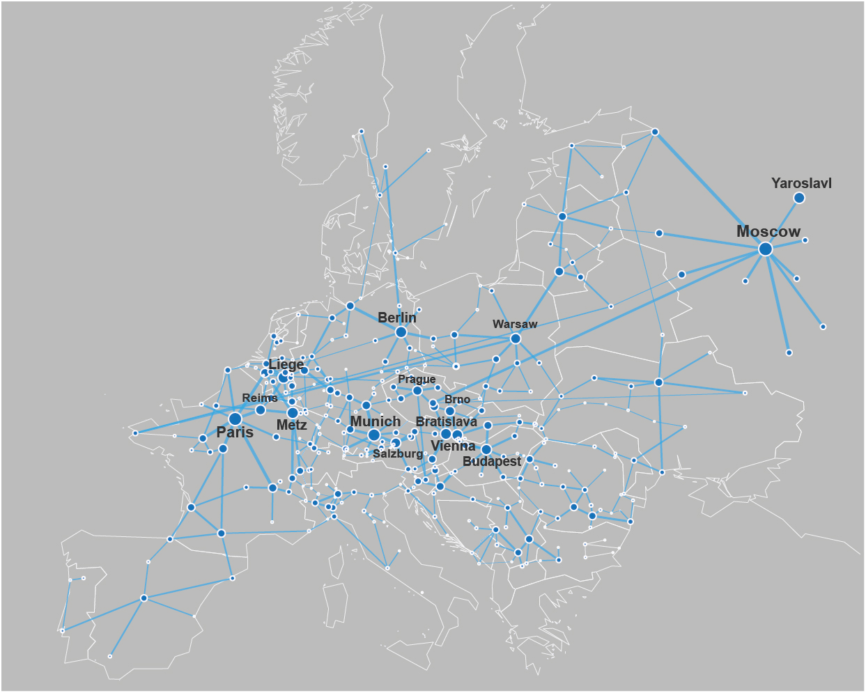 Euro road network where nodes are cities and edges are roads connecting different European cities. The picture shows a portion of the Euro road network limited to the cities with Forman-Ricci curvature ≤ −2 and edges connecting them. Cities with highly negative Forman-Ricci curvature (< −7) are labeled in the figure. Size of nodes and width of edges are proportional to the absolute value of the corresponding Forman-Ricci curvature.