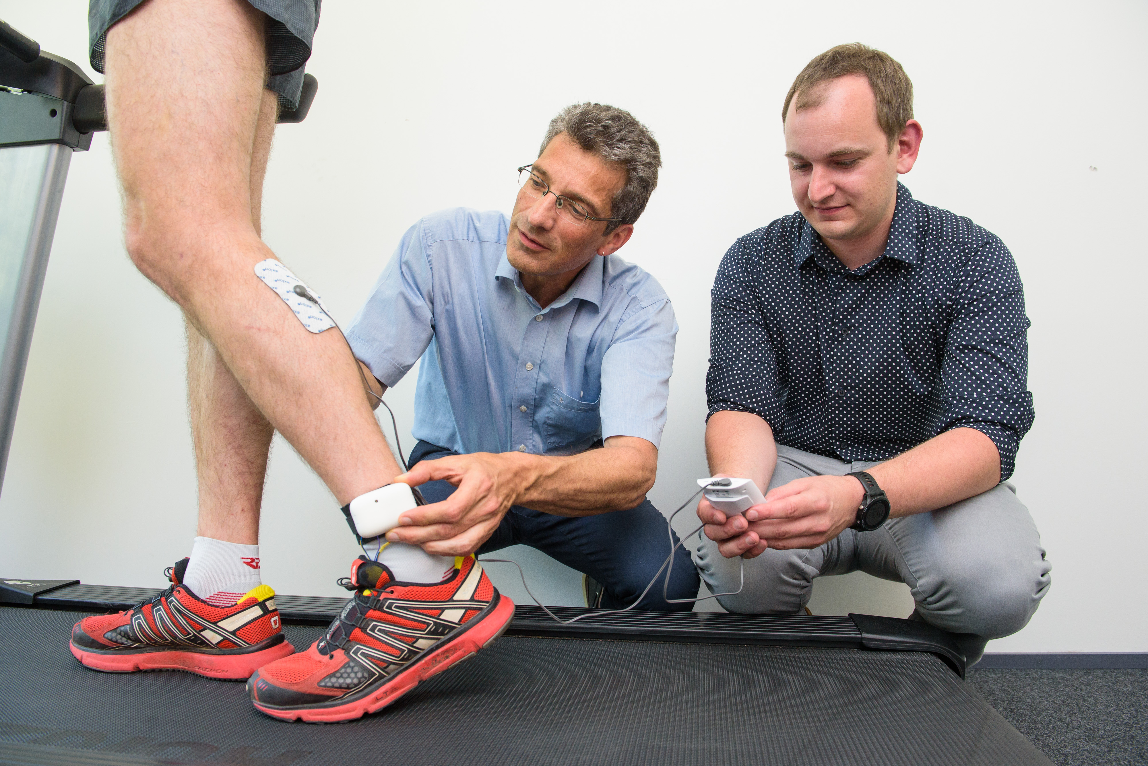 Die schmerzlosen Stromstöße kommen von Elektroden, die sich der Läufer auf die Wade klebt. Den für die Steuerung notwendigen EMS-Generator und die Kontrolleinheit, einen Arduino-Mikrokontroller, trägt der Läufer ebenfalls am Körper. In den Schuhen befinden sich Einlegesohlen, die mit Drucksensoren versehen sind. Durch die Sensoren können die Forscher nicht nur erkennen, ob der Läufer mit Ferse, Mittel- oder Vorderfuß auftritt, sondern auch, ob der Fuß gerade am Boden oder in der Luft ist. Ist Letzteres der Fall und wurde zuvor der Auftritt per Ferse erkannt, löst die Kontrolleinheit einen schwachen, schmerzlosen Stromimpuls aus und der Wadenmuskel klappt den Fuß nach vorne. Der Läufer trifft dadurch nun mit Mittel- und Vorderfuß auf, läuft effizienter und schont seine Gesundheit.