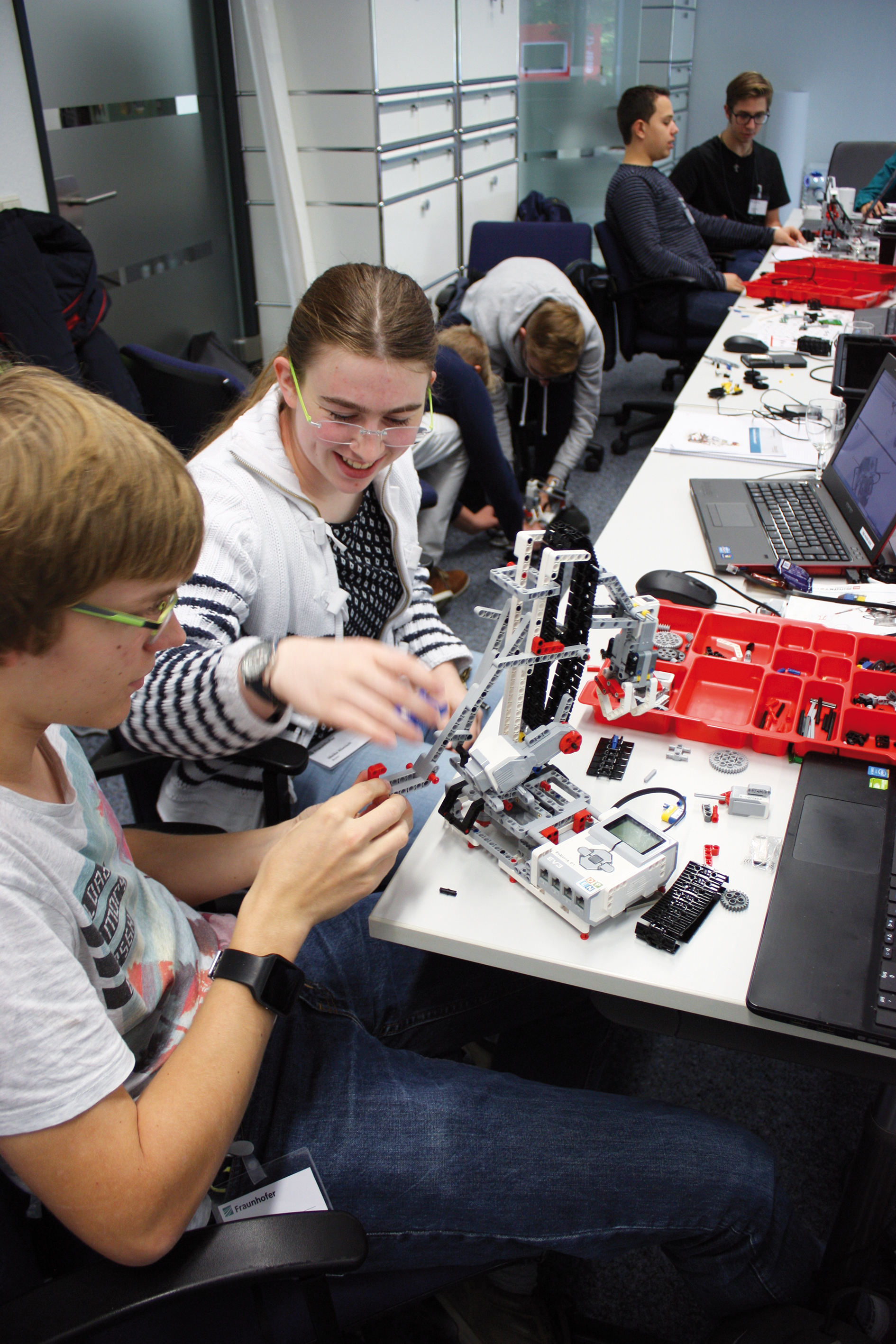 Im Workshop »Algorithmen in der Praxis – Robotik-Systeme selbst programmieren« beschäftigen sich die Teilnehmenden mit Algorithmen, die uns das tägliche Leben erleichtern. Heizungsregelung, intelligente Waschmaschinen und selbstfahrende Autos sind bekannte Beispiele dafür. Im Workshop lernen die Nachwuchstalente verschiedene Lösungsansätze und Algorithmen zur Regelung solcher Systeme kennen, entwickeln eigene Lösungen und überprüfen diese mit einem selbstbalancierenden Roboter.