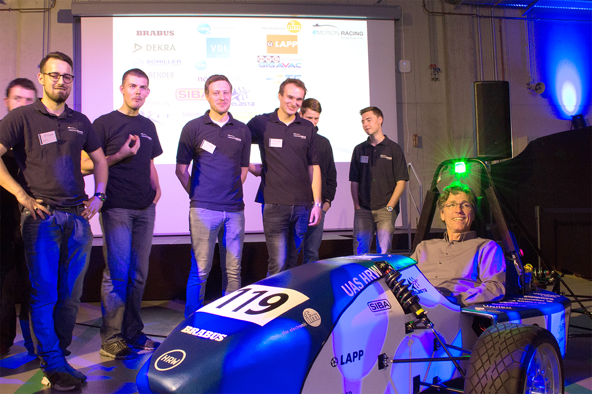 Im Technikum des Instituts Maschinenbau der Hochschule Ruhr West wurde das Prachtstück, das den Namen EM03 trägt, feierlich enthüllt. Prof. Dr. Oliver Koch, Vizepräsident Forschung und Transfer, und Prof. Dr. Joachim Friedhoff, Institutsleiter Maschinenbau, würdigten die Leidenschaft und die fachliche Expertise der Studierenden. Zu Recht – wurde doch an diesem Nachmittag wieder deutlich, welch ein Aufwand hinter der Entwicklung eines Wagens und der Teilnahme an der FSG steckt. Mit dem Rennwagen allein ist es nicht getan: Marketing und Fundraising sind nicht weniger erfolgsentscheidend. Praktisch, dass das eMotion Racing Team mit der Hochschule Ruhr West, ihren Instituten und regionalen Unternehmen (wie Brabus, Dekra, ifm, VDI und dem HRW Förderverein) starke Sponsoren im Rücken hat. Während der Präsentation bedankten sich die Projekt- und Teamleiter immer wieder bei ihren Sponsoren für die gute Zusammenarbeit.