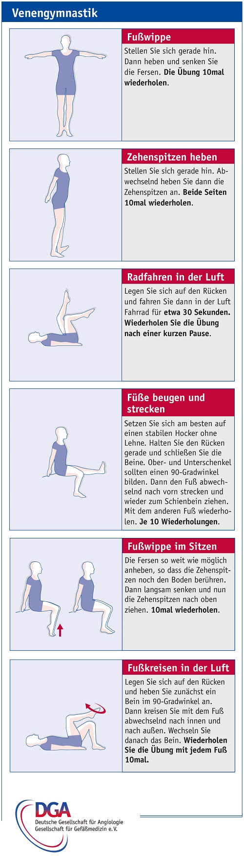 • Integrieren Sie Venengynmastik in Ihren Alltag! Wenn Sie beruflich viel sitzen oder stehen, können Sie Ihre Gefäße durch einfache Übungen auch Arbeitsplatz trainieren. Übungen finden Sie hier: https://goo.gl/4IO7BU