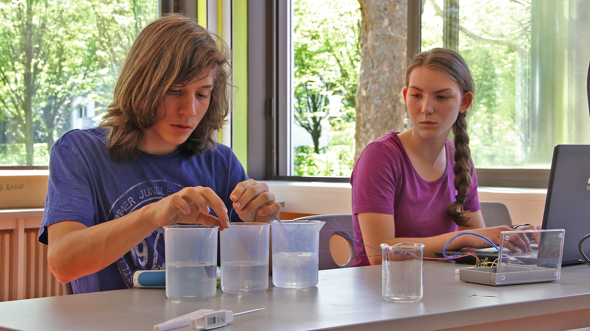 Konzentriert sitzen die Mädchen und Jungs der 9a des Windeck-Gymnasiums Bühl (WGB) im Praktikum des Profilfachs Naturwissenschaft und Technik (NwT) an ihren Experimenten. Sie berechnen und messen die Leitfähigkeit verschiedener Drähte, bauen Widerstände in Parallel- und Reihenschaltungen ein und lernen, dass ein kleinerer Querschnitt eines Drahtes einen höheren Widerstand bedeutet. Doch auch Temperaturänderungen führen zu einem geänderten Widerstand, was zur Temperaturmessung genutzt werden kann. Damit experimentieren die Schüler des WGB.