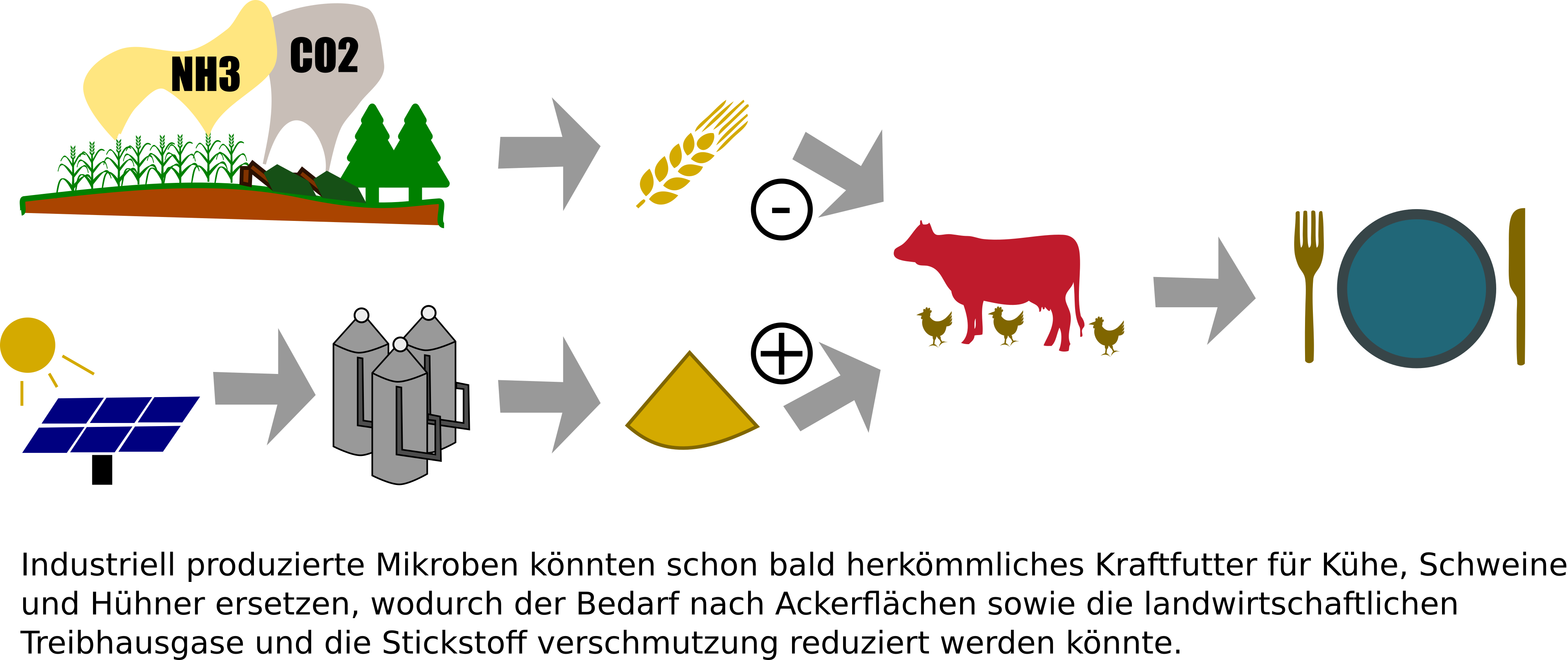 "Kühe, Schweine und Hühner werden mit sehr proteinreichem Futter gemästet. Inzwischen wird die Hälfte der auf Ackerland angebauten Proteine an Tiere verfüttert", sagt Benjamin Leon Bodirsky, Autor der Studie des Potsdam-Instituts für Klimafolgenforschung (PIK). Ohne drastische Veränderungen im Agrar- und Ernährungssystem wird der steigende Bedarf an Nahrungs- und Futtermitteln, der mit unserer fleischreichen Ernährung einhergeht, wohl zu kontinuierlicher Entwaldung, Verlust der biologischen Vielfalt, Stickstoffbelastung und klimawirksamen Treibhausgasemissionen führen. Neuerdings ist eine neue Technologie im Gespräch, die diese negativen Umweltauswirkungen verringern könnte: Mikroben werden mit Energie, Stickstoff und Kohlenstoff kultiviert, um Proteinpulver herzustellen. Dieses kann dann etwa anstelle von Sojabohnen an Tiere verfüttert werden. Die Züchtung von Futterprotein in industriellen Anlagen statt auf Ackerland könnte helfen, einige Umwelt- und Klimaauswirkungen der Futtermittelproduktion zu mildern. Da die Produktion recht günstig ist dürfte sich mikrobielles Protein als Kraftfutterersatz auch ohne Subventionen durchsetzen.“