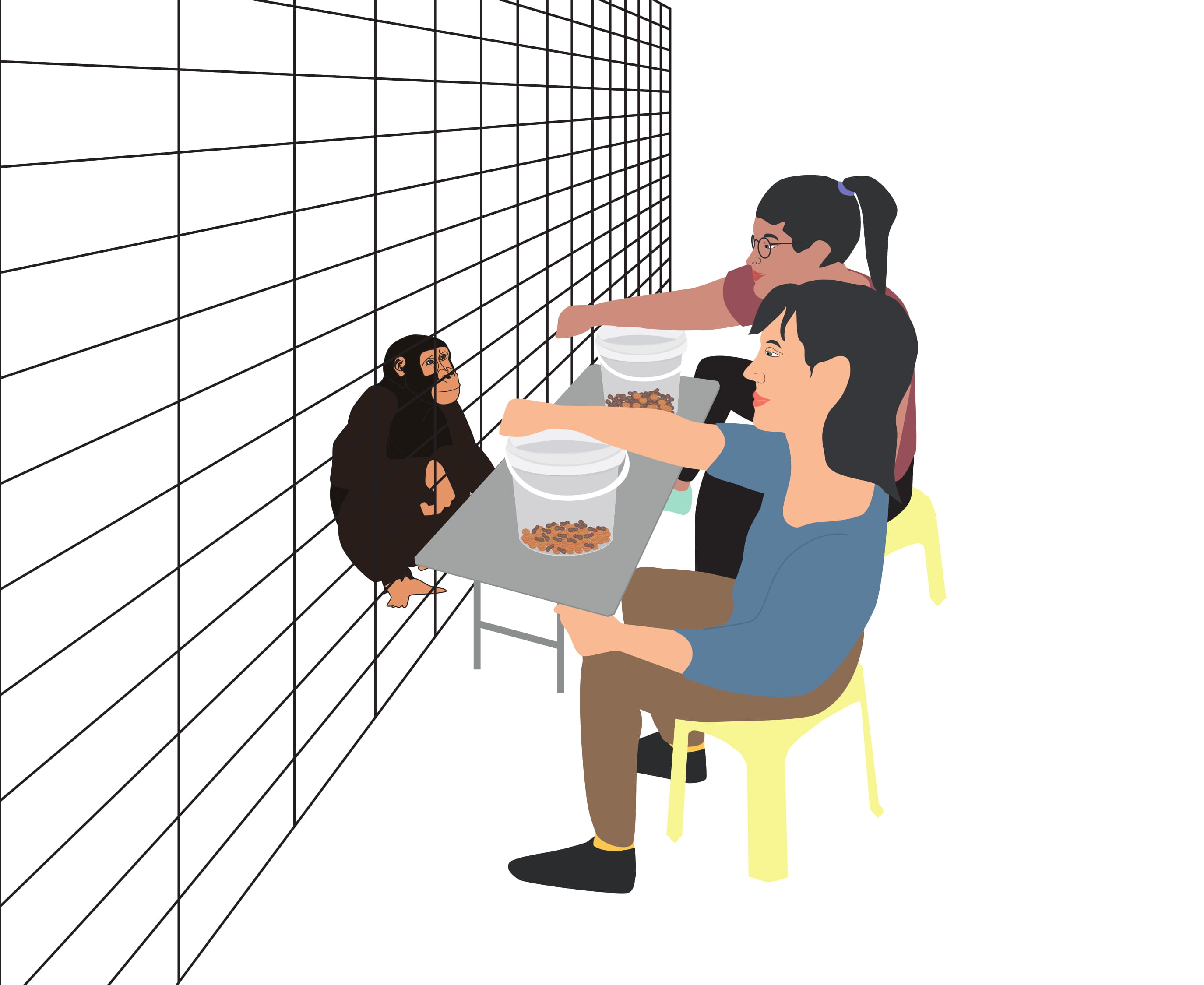 Menschenaffen mögen Erdnüsse deutlich lieber als Karotten. In einer Auffangstation in Uganda stellten die Forscherinnen und Forscher Schimpansen vor die Wahl, aus welcher von zwei Futtermischungen sie eine Kostprobe haben wollten: Eine Mischung bestand aus 200 Erdnüssen und 20 Karottenstückchen, bei der anderen waren die Verhältnisse umgekehrt. Doch zunächst mussten die Schimpansen Menschen beobachten, die ebenfalls Kostproben entnahmen – einmal gezielt, also mit Blick auf die Futtermischung, das andere Mal blind.