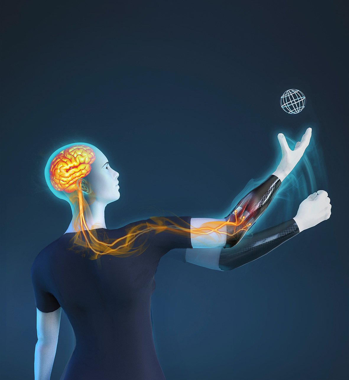 Bei dem innovativen Verfahren werden die schwachen elektrischen Signale der Muskulatur im Armstumpf von acht im Prothesenschaft integrierten Elektroden aufgenommen, verstärkt und an einen ebenfalls im Schaft integrierten Mini-Computer geschickt. Auf diesem interpretiert ein Algorithmus des maschinellen Lernens, der zuvor auf den jeweiligen Patienten trainiert wurde, die Signale. Er kann so aus den acht Signalen die Absicht des Patienten ableiten und entsprechende Steuersignale an die Prothesenmotoren schicken. Der neu entwickelte Prototyp erkennt dabei nicht nur die Art der Funktion, sondern auch die vom Patienten gewünschte Geschwindigkeit der Bewegung und zwar unabhängig für jede der beteiligten Funktionen. So ist es z.B. möglich, die Hand langsam zu drehen und gleichzeitig schnell zu öffnen.