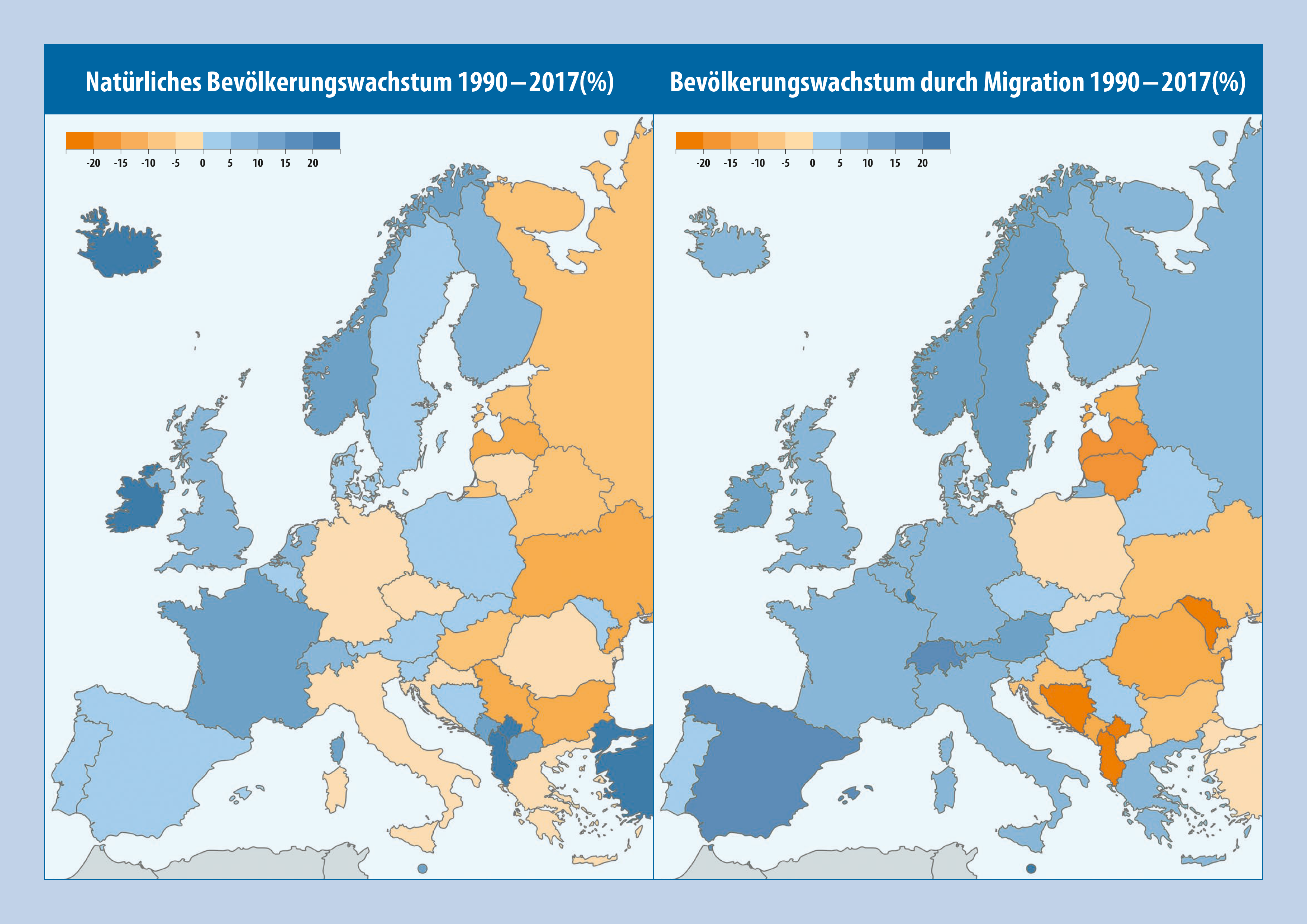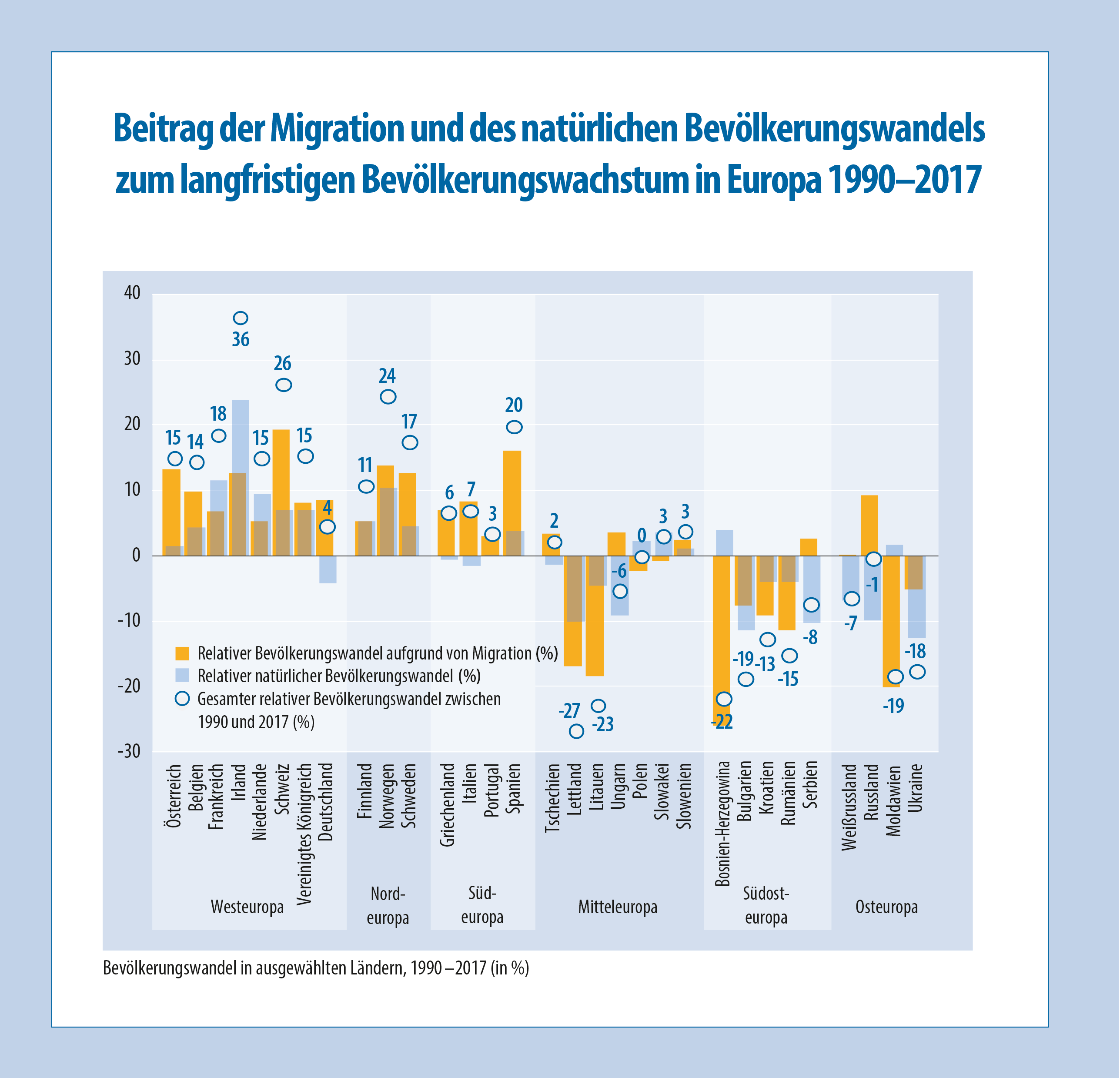 Ausschlaggebend dafür sind vor allem zwei Faktoren: Die natürliche Bevölkerungsentwicklung, die sich aus Geburten und Todesfällen ergibt, sowie die Migration, die Ab- und Zuwanderung umfasst. Trotz einiger Unterschiede zwischen einzelnen Staaten lassen einerseits eine relativ niedrige Fertilität sowie andererseits eine massive Abwanderung die Bevölkerung der meisten Länder Ost- und Südosteuropas schrumpfen. So verzeichnen Bulgarien, Lettland, Litauen, Moldawien, Bosnien-Herzegowina und der Kosovo seit 1990 Rückgänge von über 20 Prozent. In Westeuropa war es hingegen vor allem die Zuwanderung, die die Bevölkerung im gleichen Zeitraum deutlich wachsen hat lassen. Besonders stark ist diese Steigerung in Irland, der Schweiz, Norwegen und Spanien zu sehen, wo die Bevölkerung im Vergleich zu 1990 jeweils um mehr als ein Fünftel gewachsen ist. Auch Österreich verzeichnete ein Bevölkerungswachstum von rund 15 Prozent.