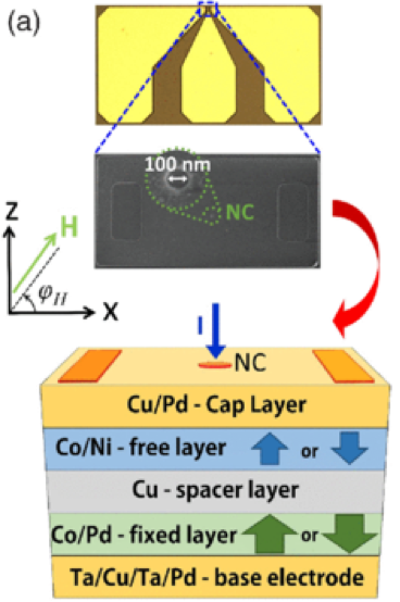 Abbildung 1 zeigt so ein magnetisches Bauteil, das Gräfe unter dem Mikroskop beobachtet hat. Es besteht aus verschiedenen Schichten. Innerhalb der blauen Schicht aus Kobalt (Co) und Nickel (Ni), dem sogenannten „free layer“, hat Gräfe seine interessante Entdeckung gemacht. Er leitete Strom durch einen 80 nm kleinen Nanocontact (NC im Bild) in das magnetische Bauteil. Er hat damit das simuliert, was passieren kann, wenn magnetische Hochgeschwindigkeitsspeicher Informationen schreiben. „Irgendwie lassen sich so Daten in dieser Kobalt-Nickel-Schicht einprägen, aber wie genau das funktioniert, wusste niemand. Es war bis jetzt immer eine Blackbox“, erklärt Gräfe. Der Forscher zeigt nun aber, dass wenn Strom zum Schreiben von Daten auf das magnetische Bauteil trifft (wie in Abbildung 2 zu sehen ist), die magnetische Schicht unterhalb des Nanokontakts sich so verhält, wie wenn ein Wassertropfen auf eine Wasseroberfläche fällt. Nur „die durch den Strom in Schwung geratene Fläche innerhalb der magnetischen Schicht ist doppelt so breit wie der Nanocontact (grüner Ring) groß ist – eine Überraschung! Man hätte eigentlich erwartet, dass der Durchmesser der magnetischen Schicht genauso groß ist wie der Nanocontact breit ist. So dachte bis jetzt die Wissenschaftswelt.“ Aber was Gräfe beobachtete, war, dass der Durchmesser doppelt so groß war, weil zusätzliche Effekte auf das magnetische Tröpfen wirken. Gräfe führt dazu aus: „die große Diskrepanz entsteht vor allem durch den Zhang-Li-Drehmoment, der einen Druck nach außen auf den Tropfenumfang ausübt. Elektrische Messungen an Tröpfchen, die mit einem umgekehrten Strom im antiparallelen Zustand nukleiert wurden, bestätigen dieses Bild.“