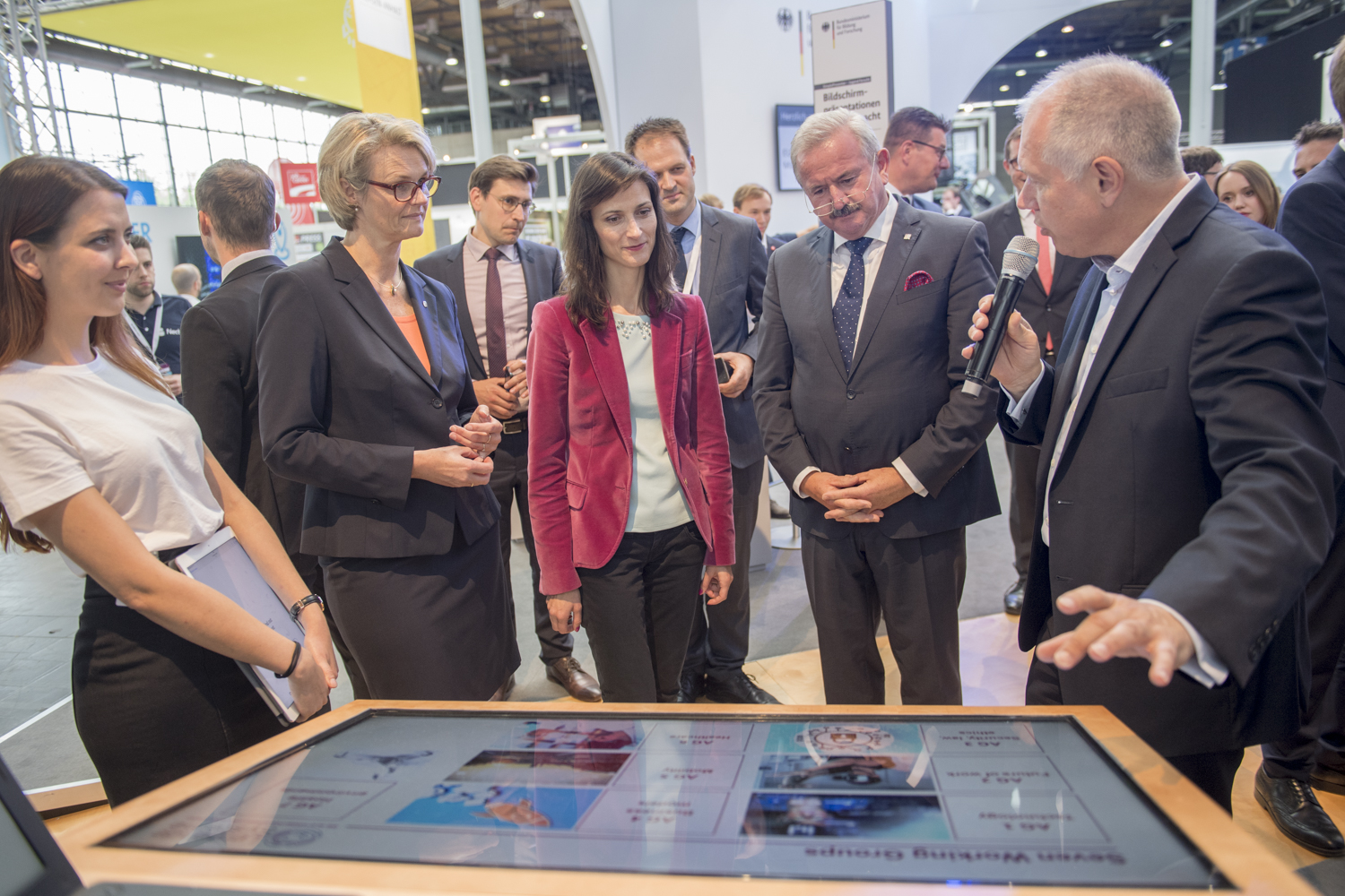 Bundesforschungsministerin Anja Karliczek, Co-Vorsitzende der Plattform Lernende Systeme, besuchte gemeinsam mit EU-Kommissarin Mariya Gabriel am 12. Juni die Plattform Lernende Systeme am Stand des Bundesministeriums für Bildung und Forschung (BMBF). Reimund Neugebauer, Präsident der Fraunhofer Gesellschaft, und Frank Riemensperger, Vorsitzender von Accenture, stellten als Lenkungskreismitglieder der Plattform deren Arbeit und Ziele vor.