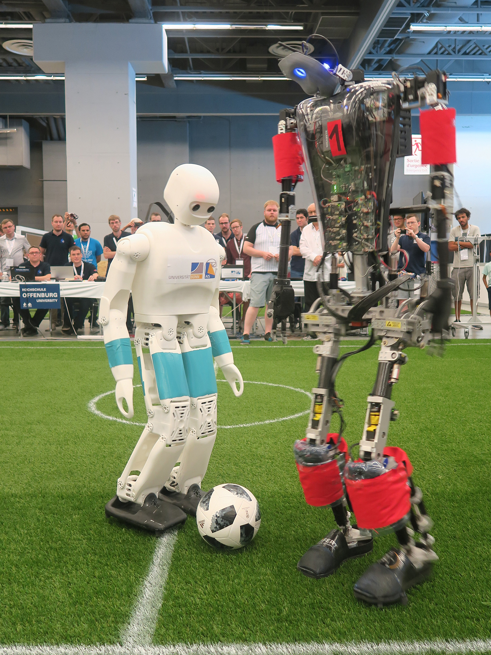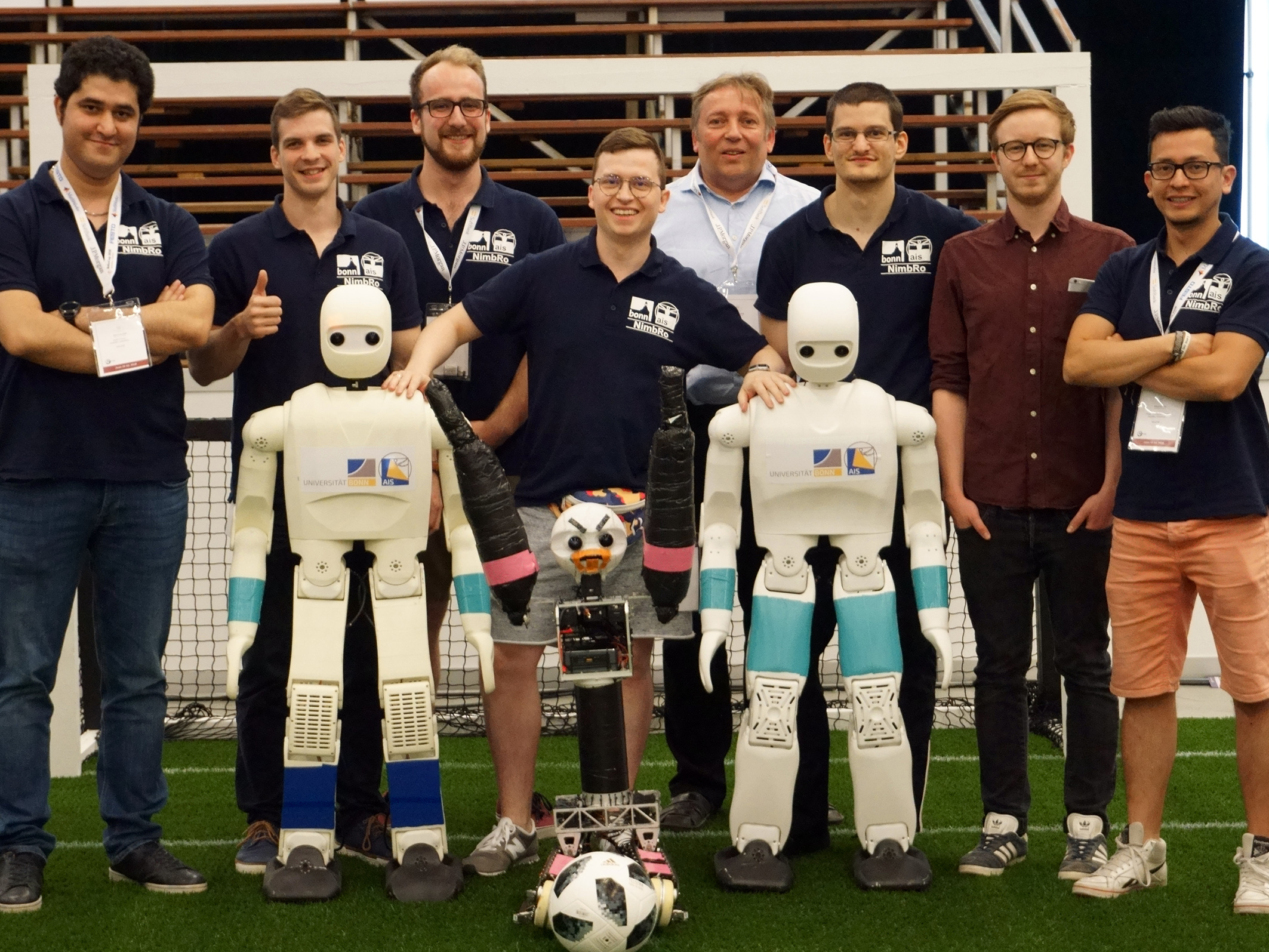 Das Bonner Team NimbRo aus der Arbeitsgruppe Autonome Intelligente Systeme des Instituts für Informatik der Universität Bonn war angetreten, den 2017 in Nagoya (Japan) errungenen Titel in der Humanoid-AdultSize-Klasse (über 130 Zentimeter Größe) zu verteidigen. Zusätzlich zum Fußballturnier, in dem pro Mannschaft nur ein Spieler erlaubt war, fand in diesem Jahr erstmals ein Drop-in-Turnier statt, bei dem jeweils zwei Spieler aus unterschiedlichen Mannschaften gemeinsam spielten.