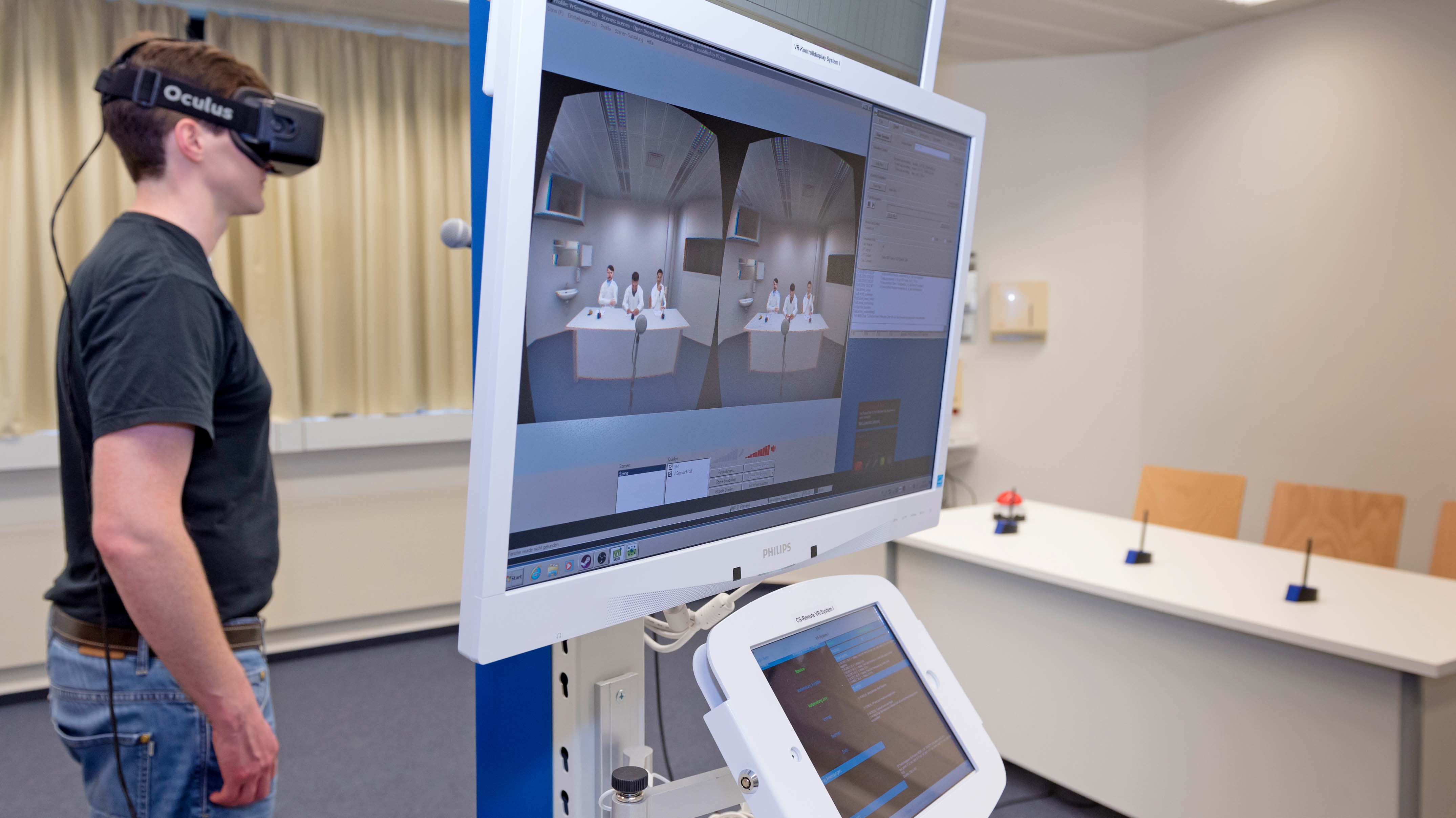 Das gilt beispielsweise für die beiden Doktoranden Benjamin Buttlar und Patrick Zimmer. Sie haben den etablierten Trierer Stresstest in die virtuelle Umgebung übertragen und mit der Durchführung unter herkömmlichen Bedingungen verglichen. Das Labor bietet insbesondere zwei Vorteile: Zum einen erfordert die Durchführung des Tests einen deutlich geringeren Aufwand. Zum anderen wird ein weitaus höherer Grad der Standardisierung erreicht, etwa indem die Probanden in der virtuellen Realität auf Fragesteller mit stets gleicher Mimik und Gestik treffen und somit möglicherweise verfälschende Faktoren ausgeräumt werden können.