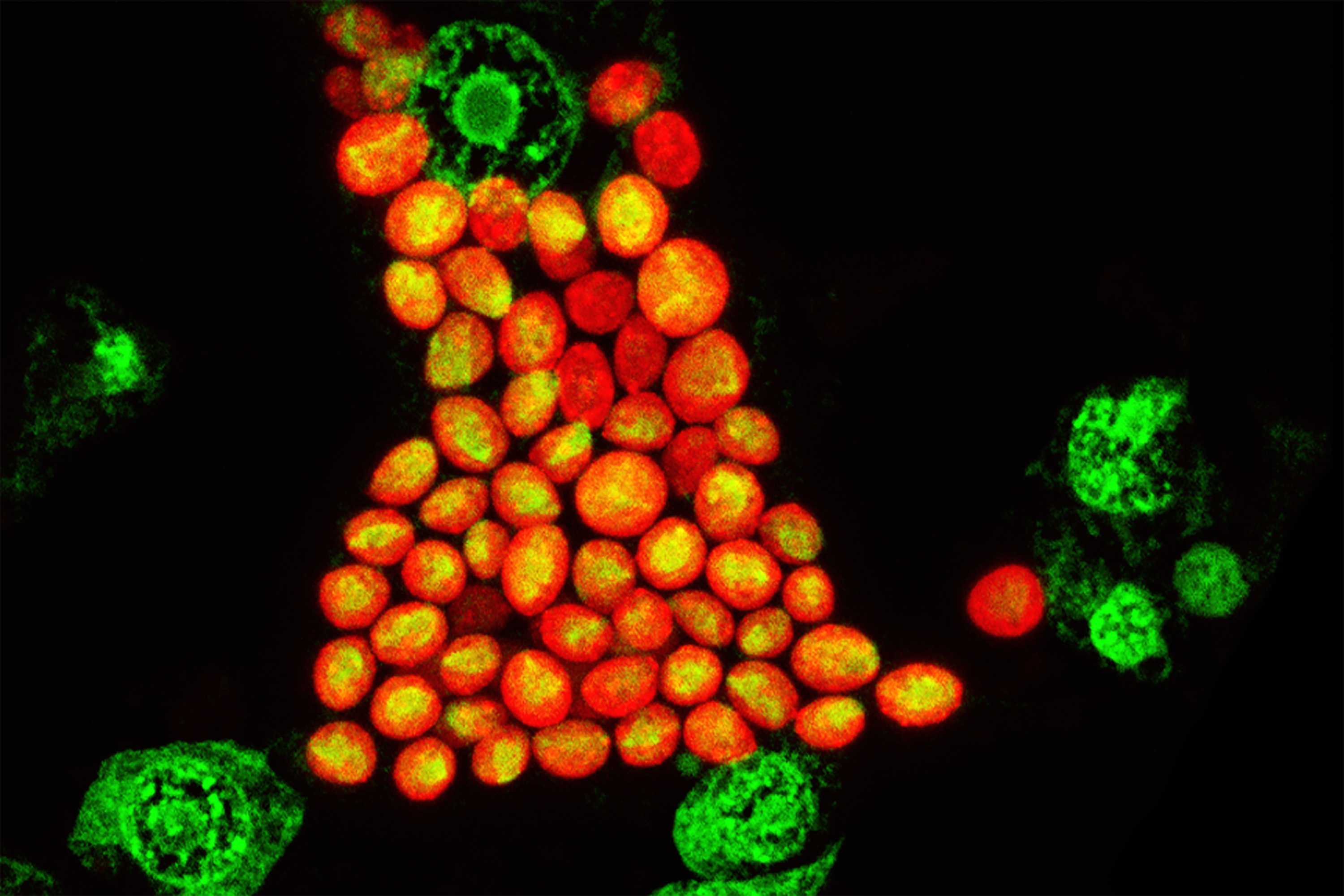 Caption: Microscopic view of Hydra-cells (nuclei appear in green) containing about 20-30 symbiotic Chlorella-algae each (in orange).