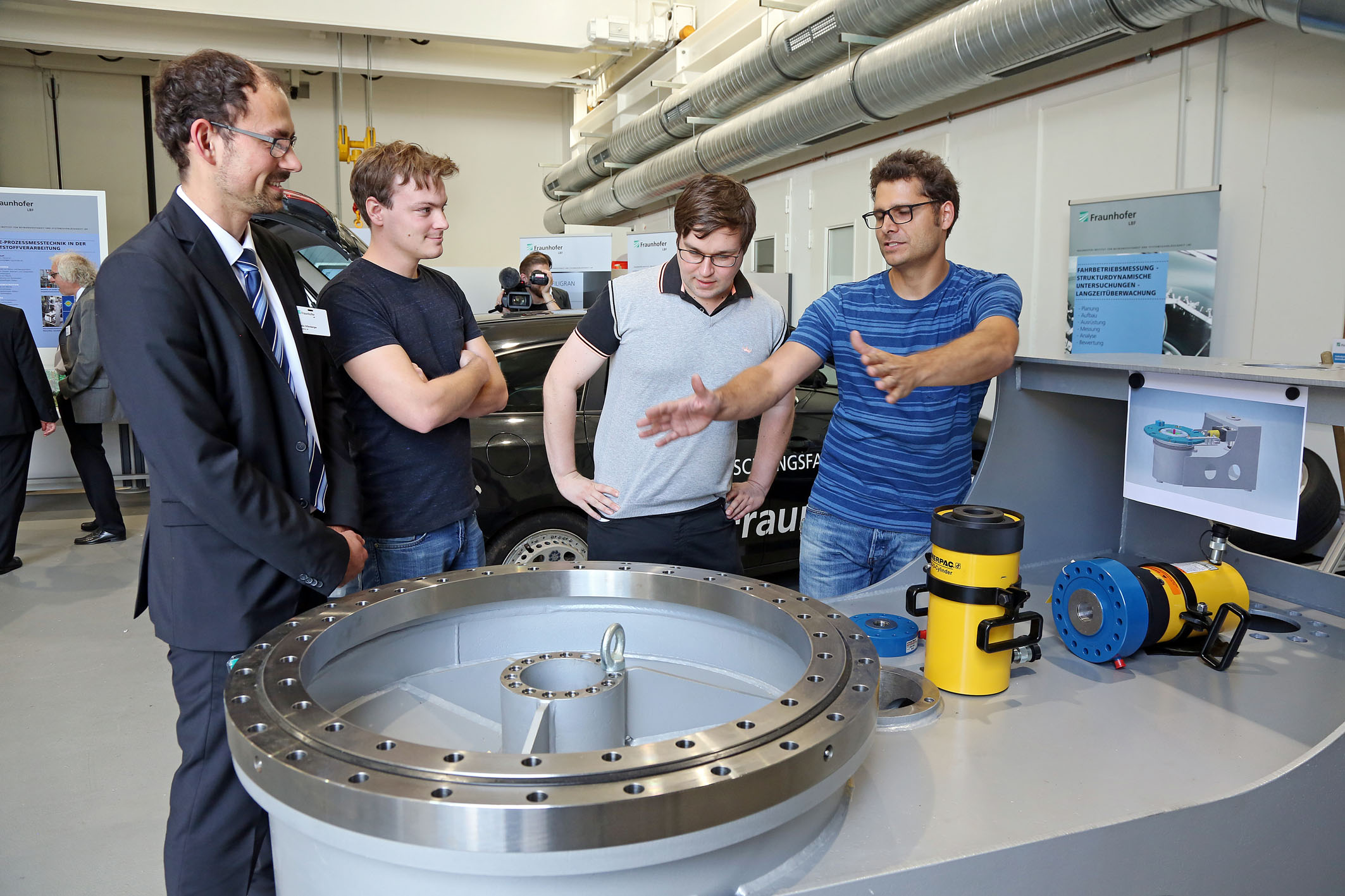 An einer in ihrer Art in Deutschland einmaligen multiphysikalischen Versuchseinrichtung auf Basis eines multiaxialen Schwingtisches (MAST) für Strukturkomponenten und Batteriesysteme wurde die Gelegenheit geboten, Prüfungen an Elektrofahrzeugen real mitzuerleben. Andere Exponate zeigten unter anderem umgesetzte hybride Leichtbauteile, die mit externen Partnern vernetzte Fahrsimulation eines Elektrofahrzeugs sowie Groß- und Kleinprüfstände der Zuverlässigkeitsforschung.