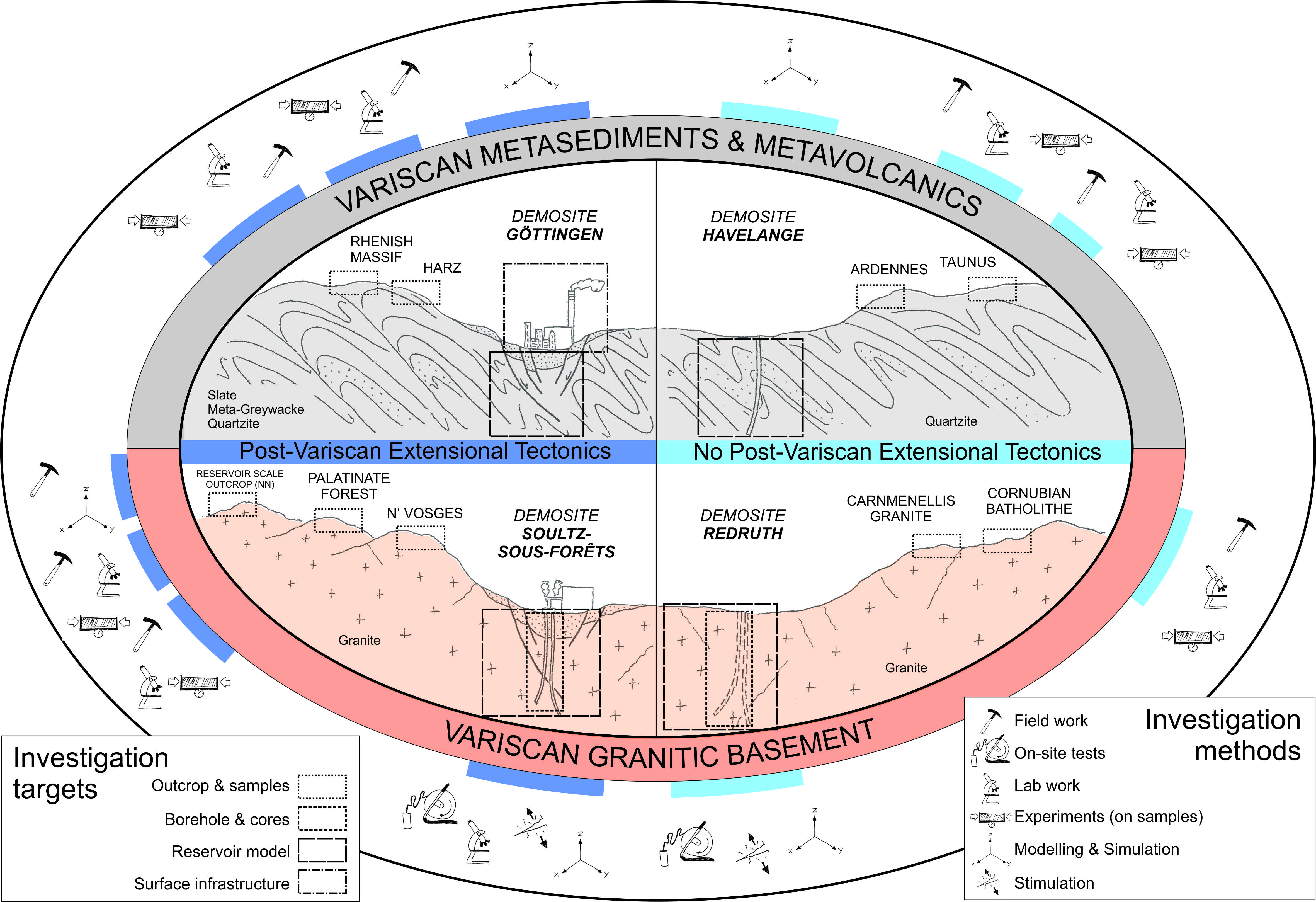 Koordinator des Projekts ist die Firma ÉS-Geothermie, die im französischen Elsass wirtschaftlich erfolgreich Tiefengeothermie-Kraftwerke betreibt und damit Strom erzeugt und Wärme gewinnt. Am Beispiel der elsässischen Anlagen wollen die Forscherinnen und Forscher beispielsweise Lösungen finden, wie sich die Ausfällung von Mineralien in den Rohren beim Abkühlen des Wassers verhindern lässt. Nur dadurch kann das nach der Stromgewinnung immer noch heiße Wasser weiter genutzt und mit kälterer Temperatur wieder in die tiefen Gesteinsschichten transportiert werden. Ein weiteres technologisches Ziel ist der Test neuartiger Turbinen zur Stromerzeugung an ehemaligen Ölbohrungen, die aufgrund des hohen Wassergehalts aufgegeben werden mussten.