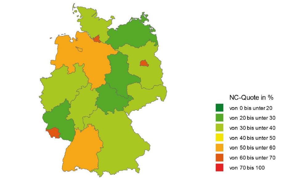 Bundesweit sind 41,1 Prozent aller Studiengänge mit einem NC belegt. Das entspricht einem Rückgang von 1,3 Prozentpunkten gegenüber dem Vorjahr. In zwölf Ländern ist der Anteil zulassungsbeschränkter Studiengänge gesunken – in Hamburg und Thüringen mit rund elf bzw. acht Prozentpunkten zum Teil sehr deutlich.