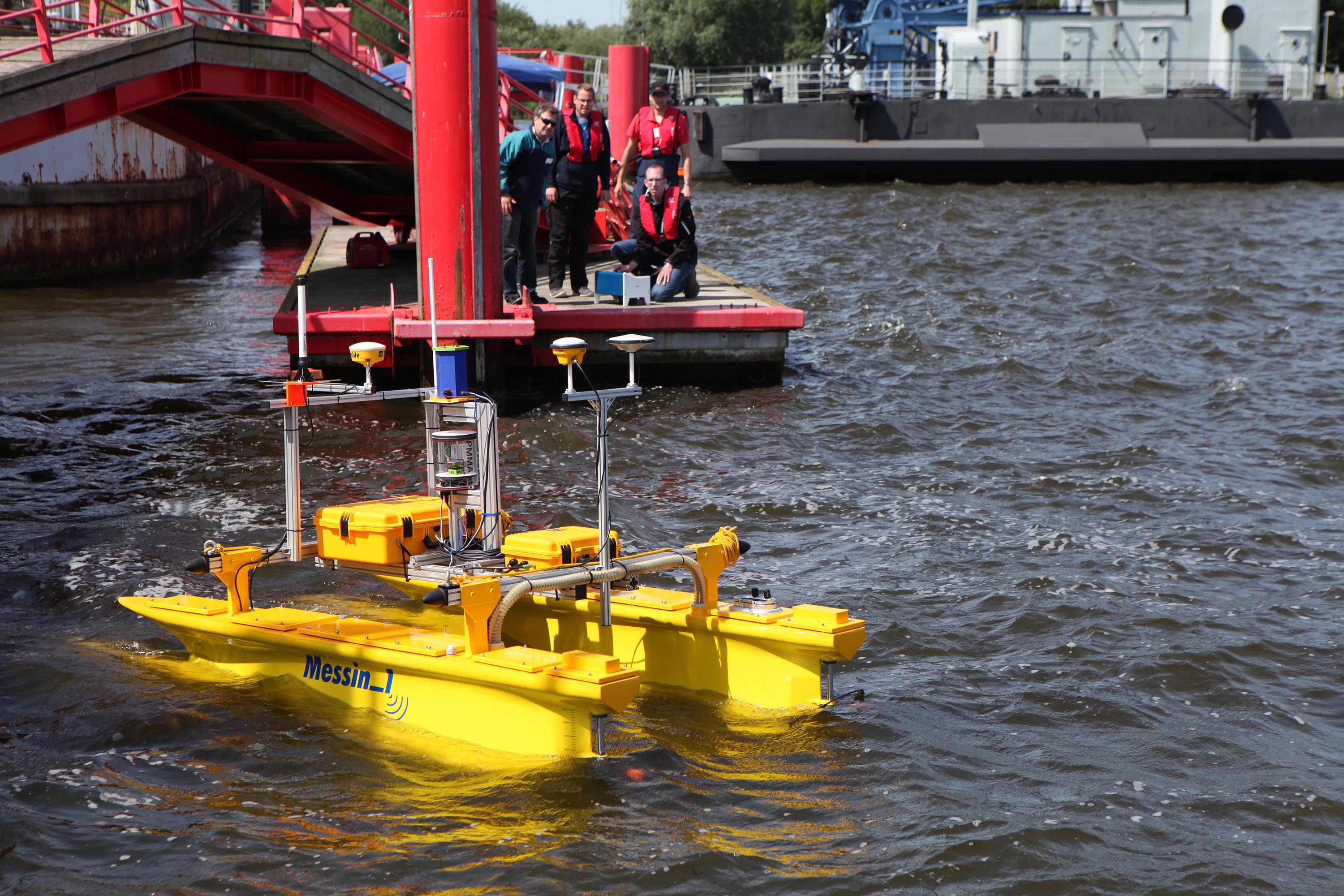 Die Abschlusspräsentation fand auf dem Traditionsschiff Typ Frieden des Schiffbau- und Schifffahrtsmuseums im IGA Park Rostock statt. Unmittelbar hinter dem Traditionsschiff – auf der Unterwarnow gegenüber dem Seehafen – wurden anhand von unterschiedlichen Testszenarien mit autonomen Wasserfahrzeugen die Potentiale des entwickelten, autonomen Systems demonstriert. Zwei Schiffe waren vernetzt und agierten kooperativ. Ein drittes, nicht vernetztes bemanntes Schlauchboot störte die beiden autonomen Fahrzeuge. Sie wichen autonom sowohl untereinander als auch dem störenden Fahrzeug unter Beachtung der geltenden Kollisionsverhütungsregelung und ihrem eigentlichen Fahrziel aus. „In einem zweiten Szenario wurde das Potential eines Nahfelderkennungssystem gezeigt, das einen Kai bei paralleler Vorbeifahrt der unbemannten Wasserfahrzeuge exakt lokalisieren kann“, so Prof. Dr.-Ing. Olaf Simanski, der das Arbeitspaket der Hochschule Wismar als Projektleiter koordinierte. Seine Arbeitsgruppe Automatisierungstechnik/ Mechatronik (ATM) hatte gemeinsam mit den Forschern des Institutes für Innovative Schiffs- Simulation und Maritime Systeme (ISSIMS) den mit insgesamt 430 Tausend Euro geförderten Projektteil zur Nahfelderkennung und der assistierten Schiffsführung bearbeitet.