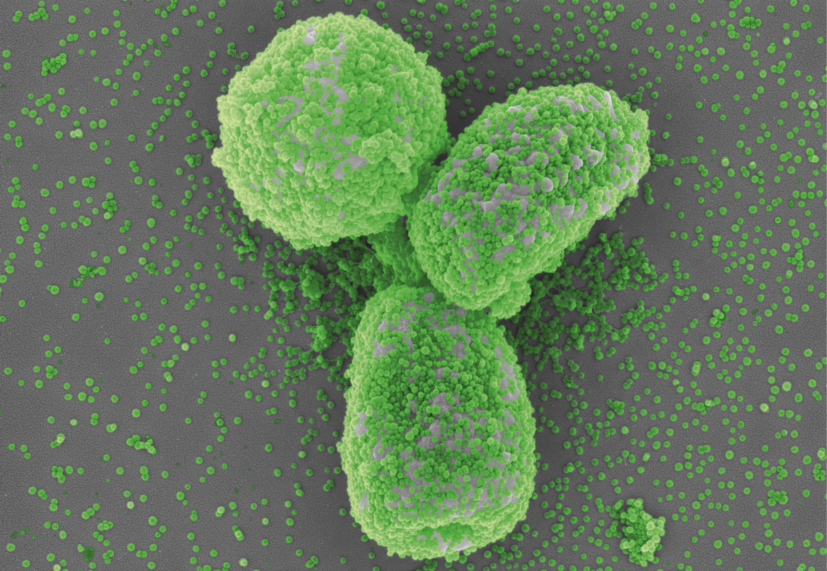 Bildunterschrift: Elektronenmikroskopische Aufnahme von mit Nanopartikeln (grün) bedeckte Aspergillus fumigatus Pilzsporen.