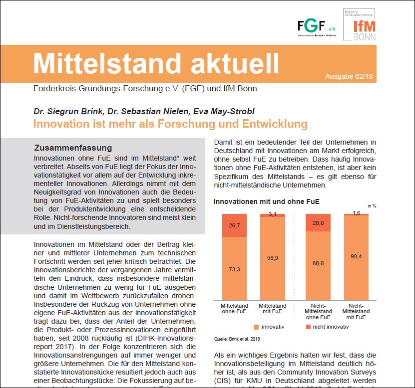 Seit November 2016 geben IfM Bonn und der Förderkreis Gründungs-Forschung e.V. (FGF) frei nach dem Motto "Aus der Wissenschaftstheorie in die Praxis" den Policy Brief "Mittelstand aktuell" heraus. Komprimiert auf zwei Seiten werden wissenschaftlich fundierte Forschungsergebnisse zu aktuellen Themen sowie Handlungsempfehlungen präsentiert.