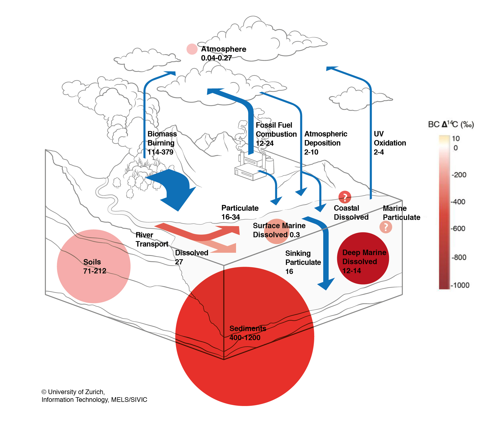 Due to its widespread occurrence and tendency to linger in the environment, black carbon may be one of the keys in predicting and mitigating global climate change. In wildfires, typically one third of the burned organic carbon is retained as black carbon residues rather than emitted as greenhouse gases. Initially, black carbon remains stored in the soil and in lakes, and is then eroded from river banks and transported to the ocean. However, black carbon is not taken into account in global carbon budget warming simulations, because its role in the global carbon cycle is not well understood as a result of a lack of knowledge about fluxes, stocks, and residence times in the environment.