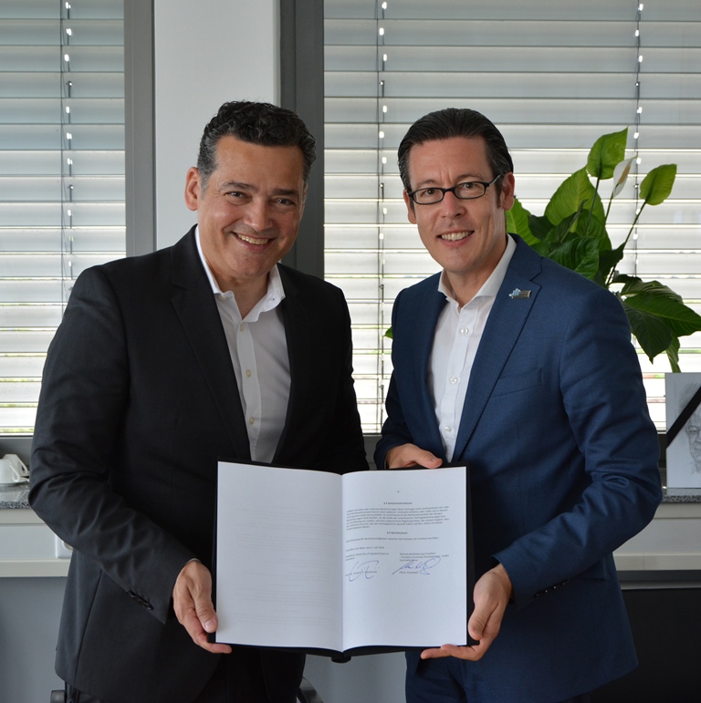 Prof. Dr. Frank E.P. Dievernich (Präsident der Frankfurt University of Applied Sciences) und Oliver Schwebel (Geschäftsführer der Wirtschaftsförderung Frankfurt GmbH) einen Rahmenvertrag mit der Zielsetzung, im Bereich Gründungsförderung eng zu kooperieren.