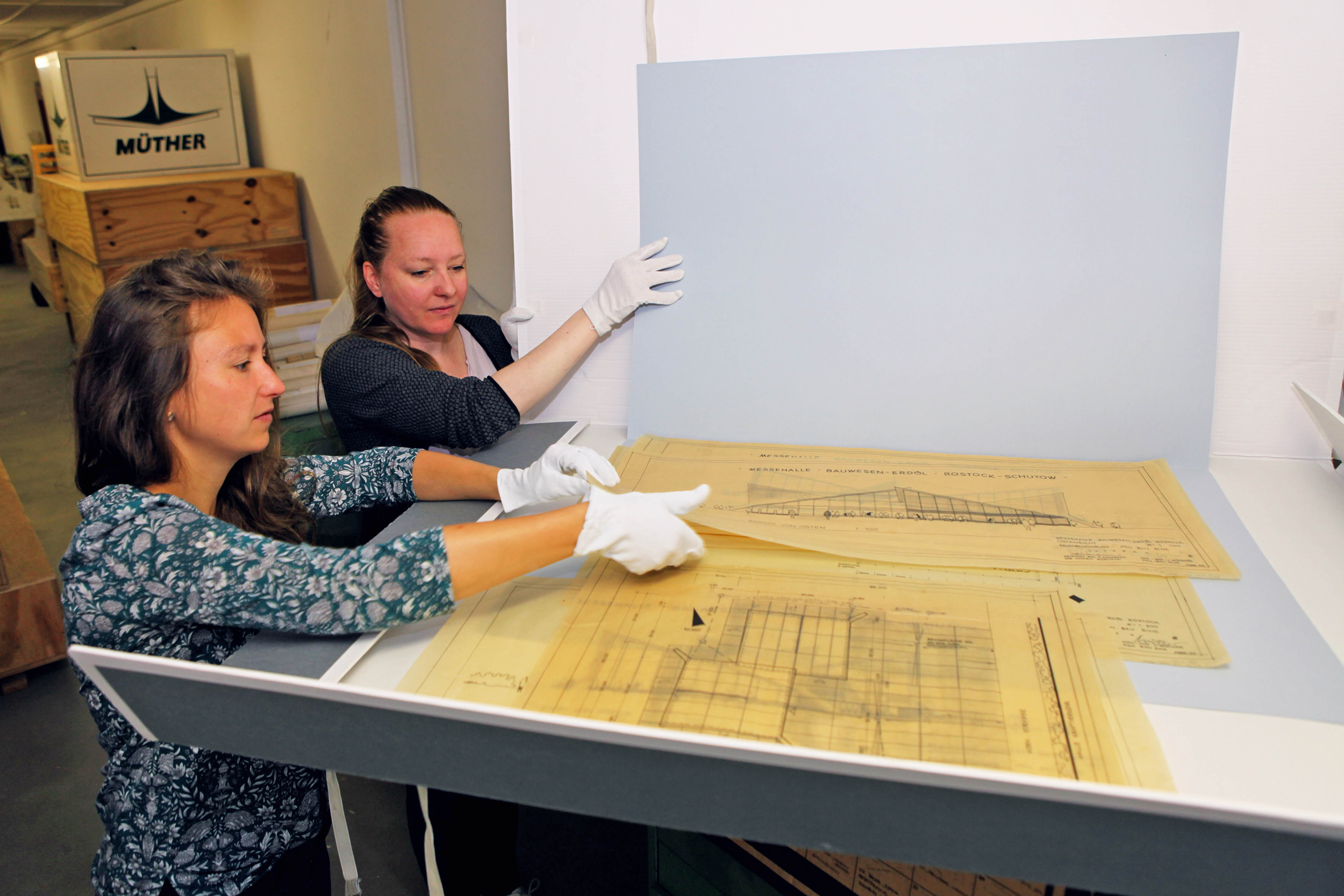 (Wismar/Berlin) Dienstag, der 10. Juli 2018, ist ein weiterer Meilenstein für die Erschließung des Nachlasses von Ulrich Müther. Mitarbeiterinnen des Müther-Archivs in der Hochschule Wismar konnten 35 frisch restaurierte Architektur- und Konstruktionspläne des bekannten Bauingenieurs und Protagonisten im Bereich der Schalenbauten, Ulrich Müther, in Empfang nehmen. Die Berliner Papierrestauratorin Susanne Grzimek hat in den vergangenen Monaten die wertvollen handgezeichneten Pläne von zwei Projekten – der Messehalle in Rostock und der Bushaltestelle in Binz – bearbeitet.