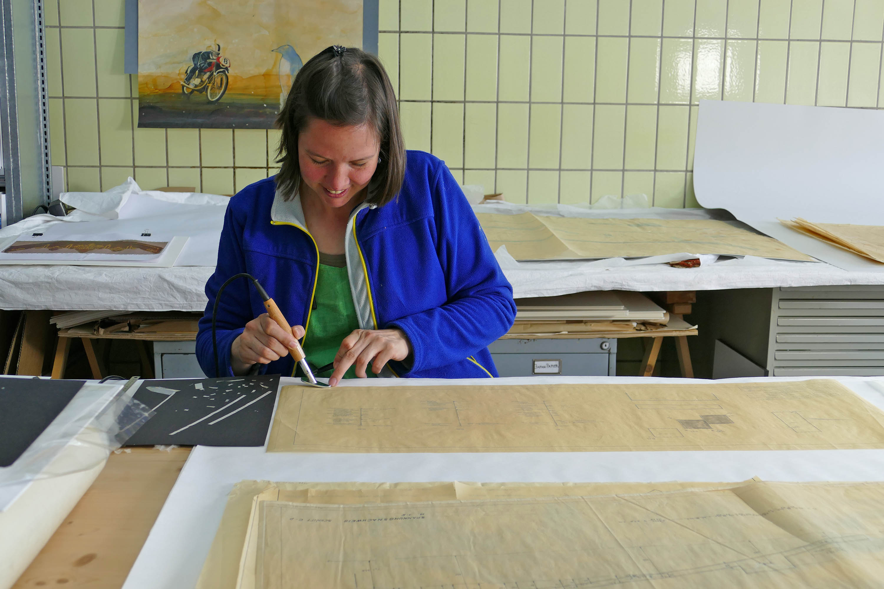 Ein Standard bei jeder Restaurierung ist die Trockenreinigung, der auch die Müther-Pläne in einem ersten Schritt unterzogen wurden. Besonderes Geschick erforderten dabei die Bleistiftzeichnungen und Notizen.