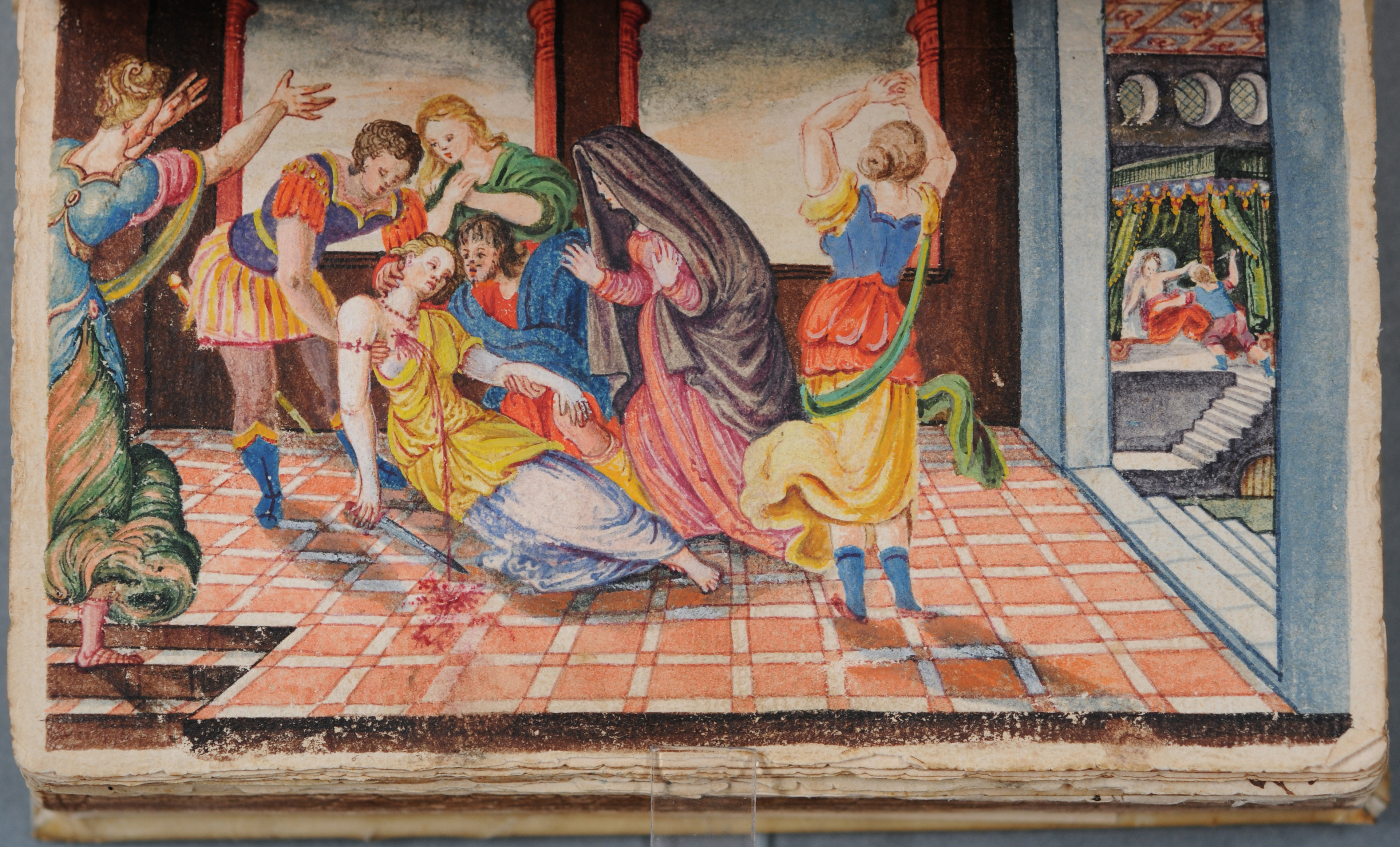 Bartholomäus Reiter arbeitet in diesem Stamm- und Wappenbuch mit seinen klaren Kompositionen und effektvollen Hell-Dunkel-Kontrasten ebenso künstlerisch erfahren wie in seinen druckgraphischen Werken. Die reich ausgestattete Handschrift beinhaltet 12 ganzseitige farbenprächtige, zumeist vom Künstler signierte Gouachen sowie 75 Eintragungen und 52 farbige Wappendarstellungen, die wohl auch zum großen Teil von Reiter stammen. Die mit feiner Hand und in leuchtenden Farben gestalteten Miniaturen sind zusätzlich mit filigranen Gold- und Silberhöhungen versehen. Die Gouachen beschäftigen sich mit allegorisch-mythischen Themen wie Europa mit dem Stier, der Häutung des Marsyas, dem Raub der Sabinerinnen oder Apoll und Daphne. Die Handschrift wird künftig die Signatur Cgm 9559 tragen.