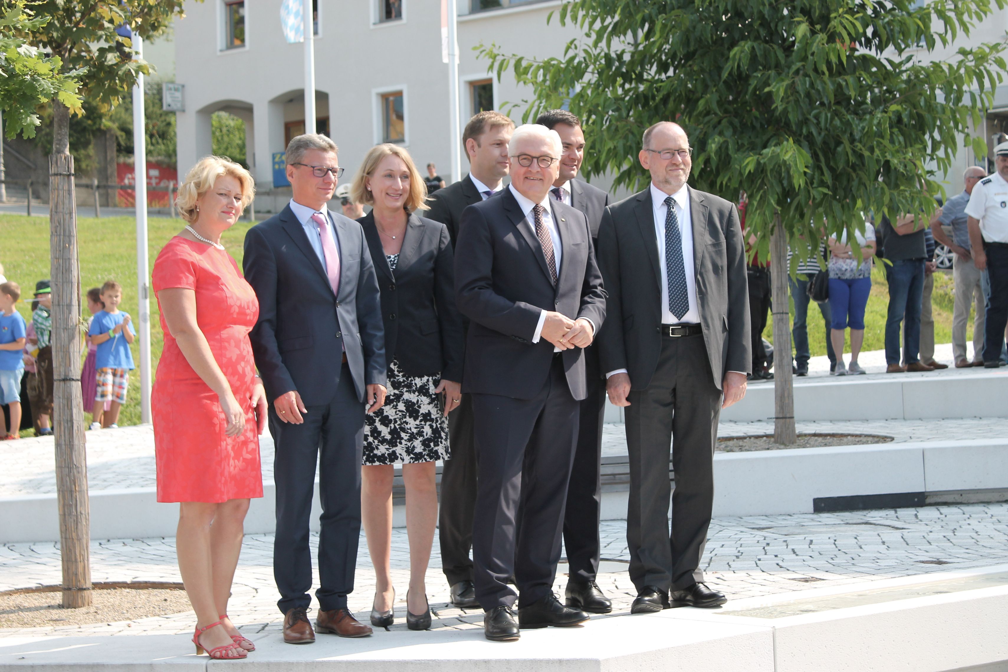 Bild 1: Frank-Walter Steinmeier mit (v.l.) MdB Rita Hagl-Kehl, Staatsminister Bernd Sibler, Campusleiterin Prof. Dr. Diane Ahrens, MdB Thomas Erndl, Landrat Sebastian Gruber, Hochschul-Präsident Prof. Dr. Peter Sperber