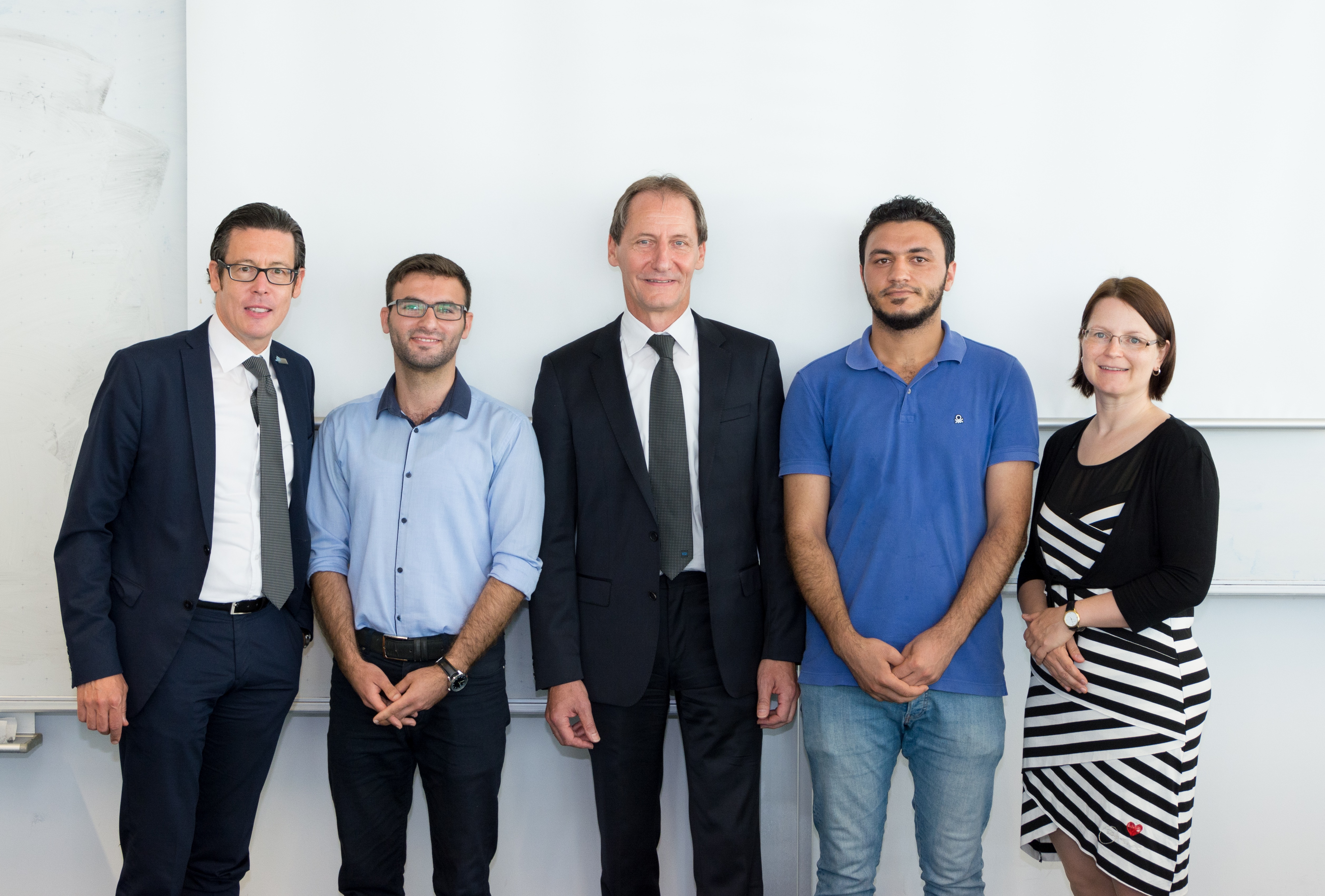 Bild 1: Für die erneute Spende des VDI Frankfurt-Darmstadt für das Willkommensjahr bedankten sich der Präsident der Frankfurt UAS, Prof. Dr. E.P. Dievernich (l.), und Vizepräsidentin Prof. Dr. Kira Kastell zusammen mit den Stipendiaten Mustafa Sawan (2.v.l.) und Khaled Alkhallawi beim Vorstandsvorsitzenden des VDI Frankfurt-Darmstadt, Prof. Dr.-Ing. Armin Huß (Mitte).