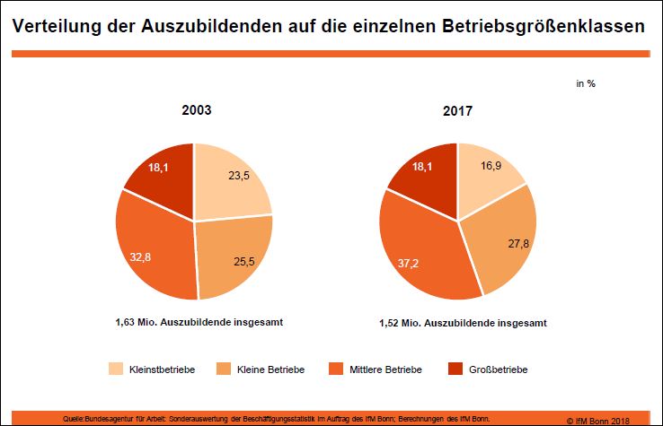 Insgesamt ist in 2017 laut Beschäftigungsstatistik der Bundesagentur für Arbeit (BA) deutschlandweit die Anzahl sowohl der auszubildenden Betriebe (+ 821) als auch der Auszubildenden (+ 8.300) im Vergleich zum Vorjahr wieder leicht gestiegen. Gleichwohl verschärft sich der Wettbewerb um den Fachkräfte-Nachwuchs: „Betrachtet man die Entwicklung der vergangenen 15 Jahre, so stellt man fest, dass die Kleinstunternehmen immer mehr ins Hintertreffen geraten: Wurde 2003 noch jeder 4. Ausbildungsvertrag in einem solchen Betrieb geschlossen, so beginnt hier nur noch jeder 6. Auszubildende sein Berufsleben“, erläutert Prof. Dr. Friederike Welter (IfM Bonn/Universität Siegen). In den kleinen und mittleren Betrieben steigen hingegen die Auszubildendenzahlen. Aber auch in den Großbetrieben wurden in den vergangenen Jahren wieder mehr Ausbildungsverträge geschlossen. Damit zeigt sich, dass weiterhin vorrangig der Mittelstand Träger des dualen Ausbildungssystems in Deutschland ist.