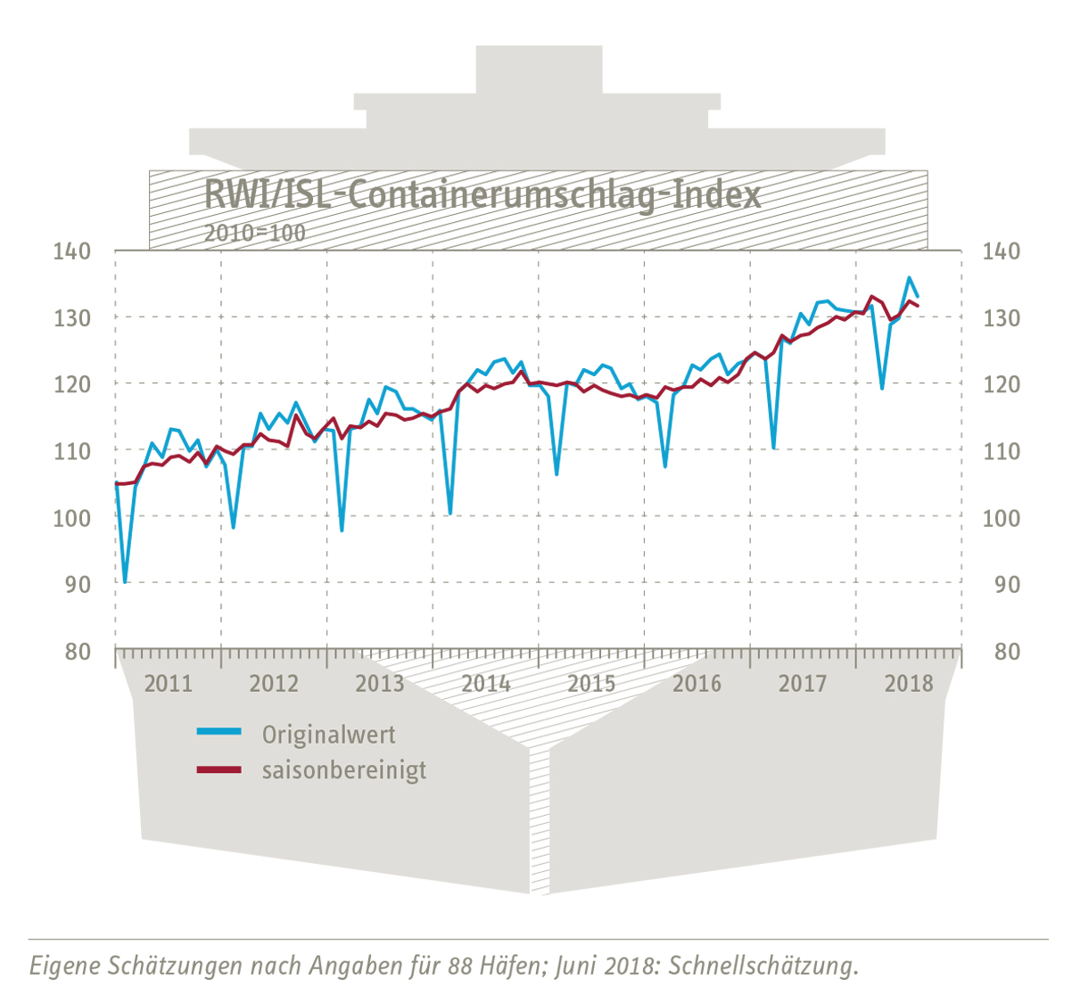Der Containerumschlag-Index des RWI – Leibniz-Institut für Wirtschaftsforschung und des Instituts für Seeverkehrswirtschaft und Logistik (ISL) ist im Juni 2018 leicht gegenüber dem Vormonat von (revidiert) 133,6 auf 132,7 zurückgegangen. Die zum 1. Juli in Kraft getretenen Zölle der USA auf viele Importe aus China könnten zu Vorzieheffekten geführt haben, was insbesondere den Anstieg des Index im Mai erklären würde, und möglicherweise ein stärkeres Minus im Juni verhindert hat.