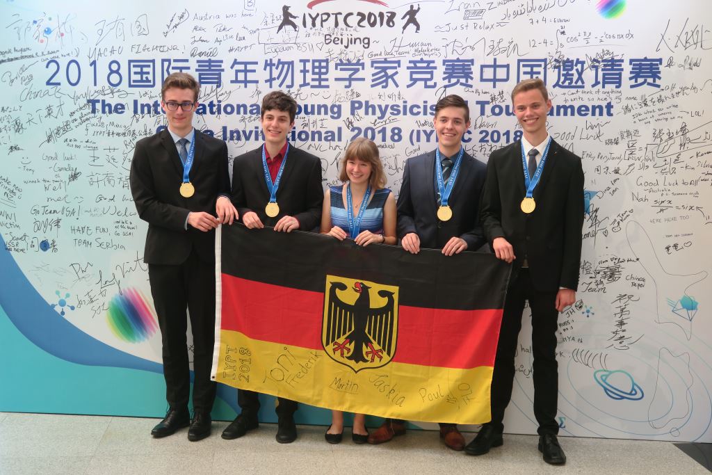 Peking / Bad Honnef, 25. Juli 2018 – Ungeschlagen qualifizierte sich das deutsche Team, bestehend aus Paul Linke (Löbau, Sachsen), Toni Beuthan (Langenau, Baden-Württemberg), Saskia Drechsel (Dippoldiswalde, Sachsen), Frederik Gareis (Kronach, Bayern) und Martin Link (Kirchheim bei München), für das Finale des International Young Physicists’ Tournament (IYPT) in Peking. Das deutsche Team um Kapitän Toni Beuthan freut sich nach beeindruckenden Wettkämpfen im Finale nun über den hervorragenden 3. Platz. Es ist damit das einzige nicht-asiatische Team, das es aufs Treppchen geschafft hat. Auf Platz 4 landete ein Team aus Südkorea. Dem Reglement zufolge erhalten alle Finalteilnehmer eine Goldmedaille.