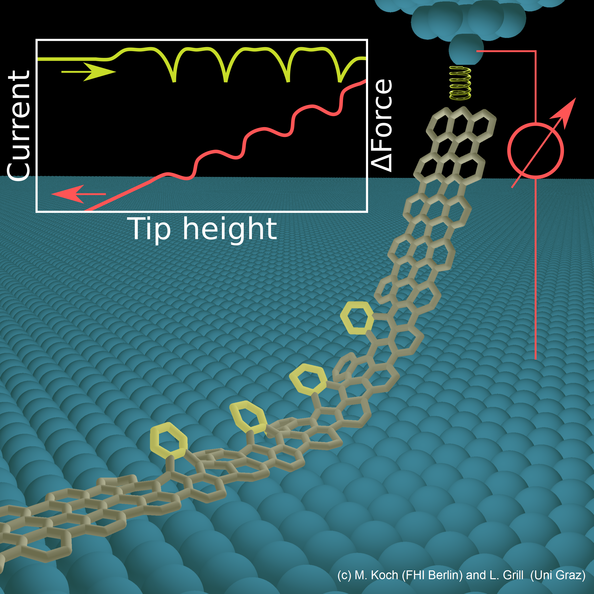 Um die Messungen durchführen zu können, setzten die Physiker durch den Einsatz der richtigen Molekülbausteine die Drähte auf einer Goldoberfläche zusammen. Durch gezielte Veränderung der Probentemperatur können sie die Defektdichte in der Kette einstellen. „Wir beobachteten, dass strukturelle Fehler in Gruppen auftreten, ein Zeichen für kooperatives Verhalten“, schildert Grill. Anschließend hoben die Forscher mit der extrem feinen Spitze eines Rastersondenmikroskops ein freies Ende eines Graphendrahtes hoch, um sowohl das elektrische Verhalten als auch die mechanischen Eigenschaften eines einzelnen Drahtes simultan und in Echtzeit zu studieren. Je mehr Defekte ein Graphendraht hatte, umso mehr konnte er gebogen werden – ein Beweis für erhöhte Flexibilität.
