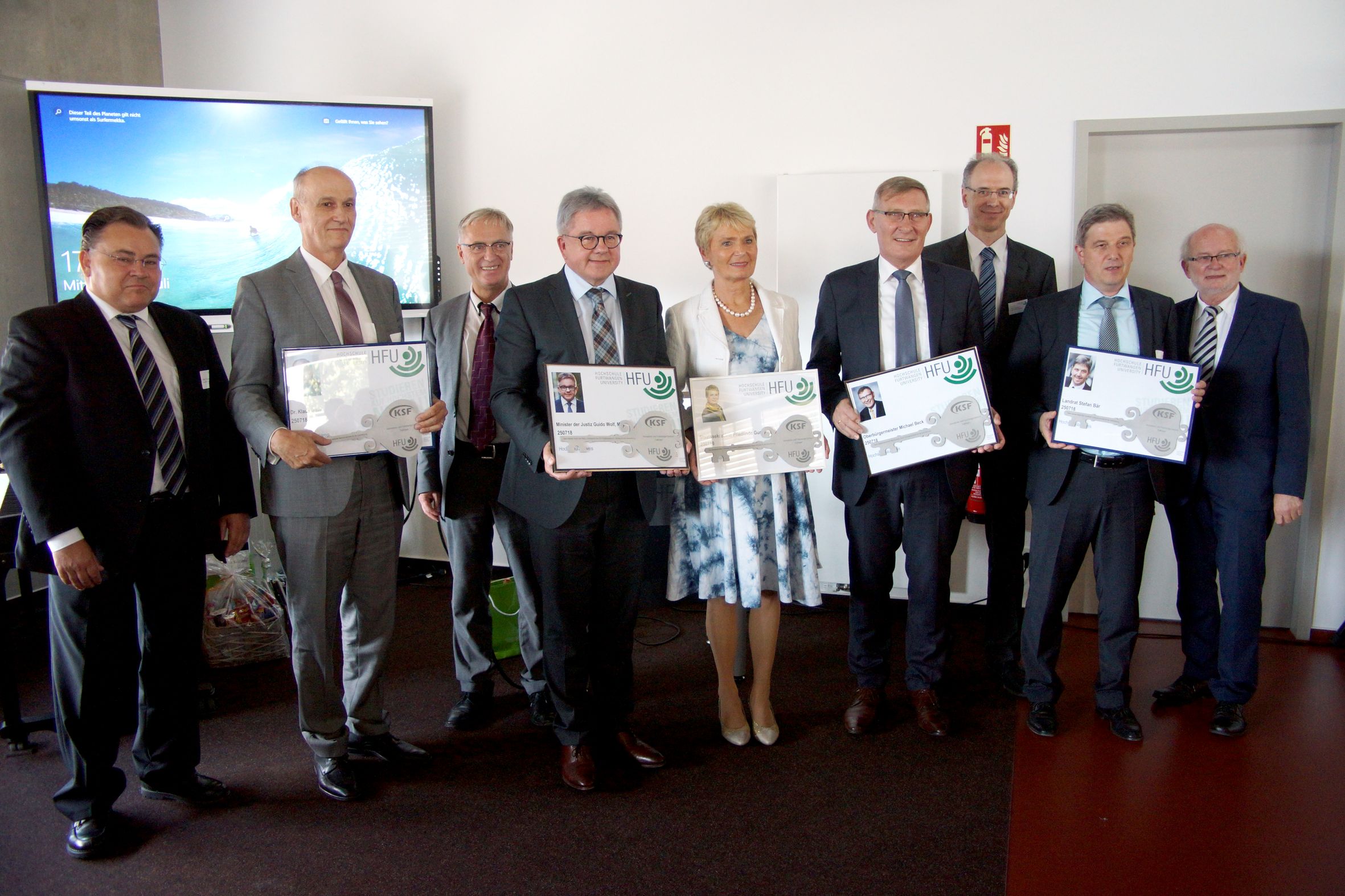 Im Rahmen der Eröffnung mit rund 200 Gästen wurde Ortwin Guhl die Ehrenbürgerwürde der Hochschule verliehen. Mit dieser besonderen Auszeichnung würdigt die HFU Guhls jahrelangen außerordentlichen Einsatz für den Hochschulcampus Tuttlingen. „Wir haben nur einen Rohstoff, unseren Grips, und den müssen wir fordern und fördern“, unterstrich Guhl.