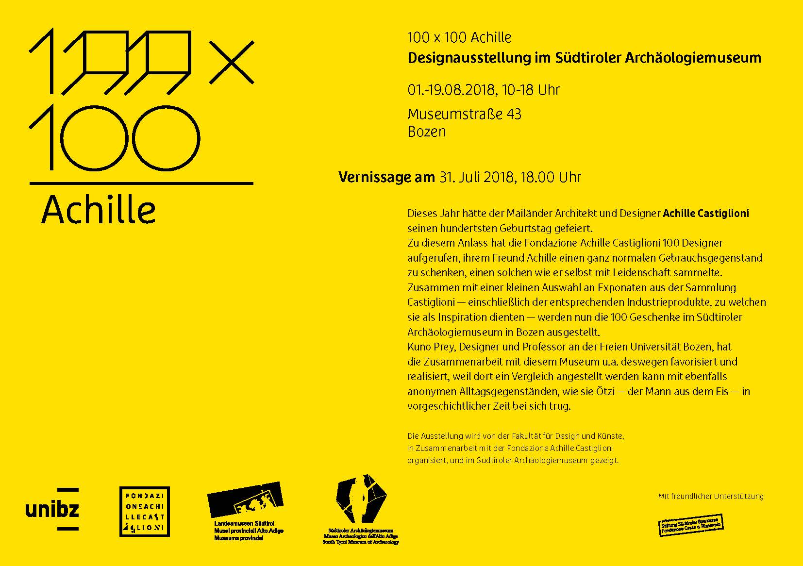 Dieses Jahr hätte der Mailänder Architekt und Designer Achille Castiglioni seinen hundertsten Geburtstag gefeiert. Zu diesem besonderen Anlass hat die Stiftung Achille Castiglioni eine große Geburtstagsfeier organisiert. Nach dem großen Erfolg in Mailand verlässt die Ausstellung 100 x 100 Achille nun die Stadti, um auf Tour zu gehen. Ihre erste Etappe wird das Archäologiemuseum in Bozen-Südtirol sein, wo die Ausstellung vom 1. bis 19. August 2018 zu sehen sein wird. Das Projekt wird in Zusammenarbeit mit der Fakultät für Design und Künste der Freien Universität Bozen organisiert.