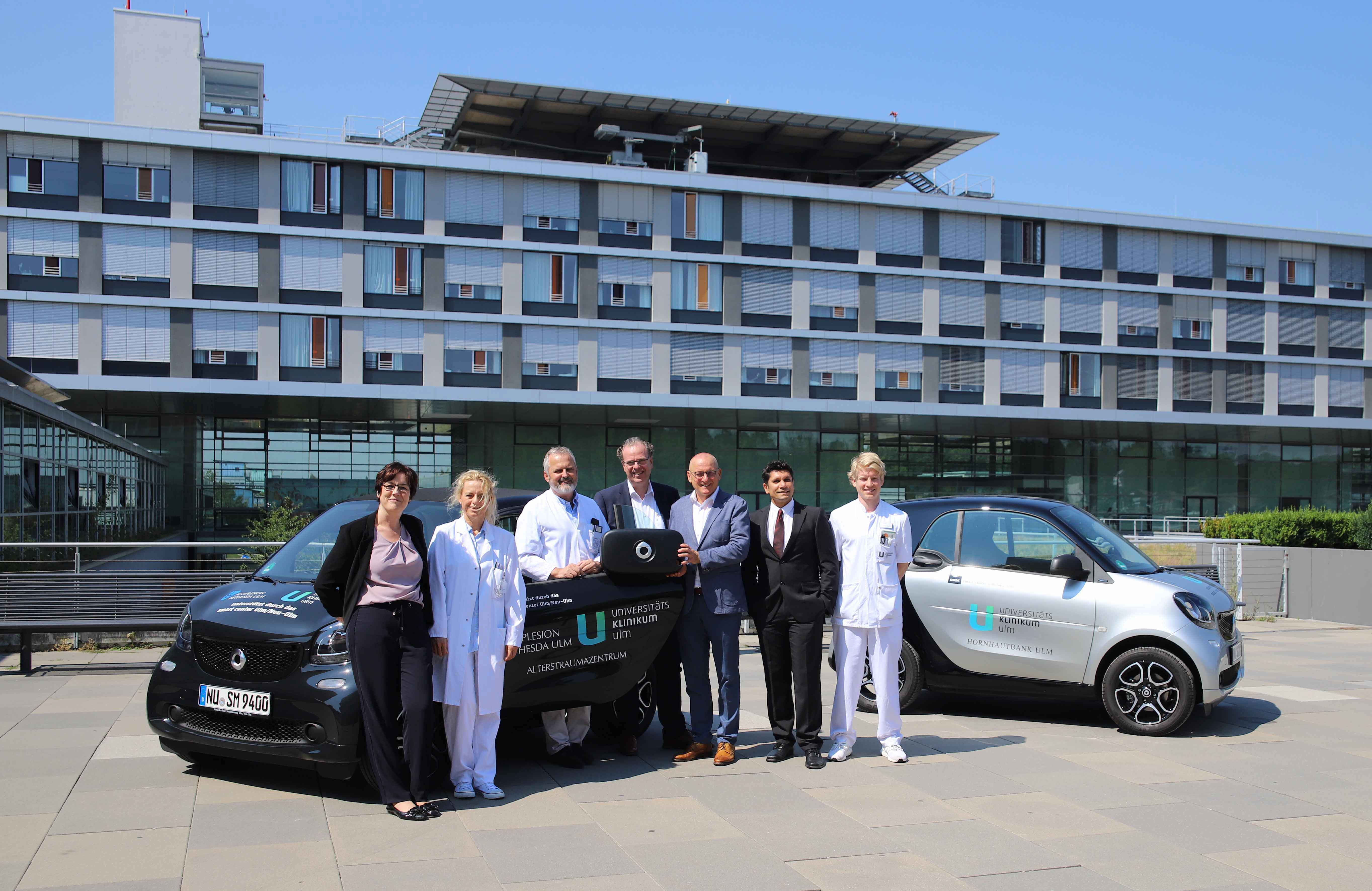 Mobil von Klinik zu Klinik: Mit zwei neuen smart fortwo sind seit kurzem die Ärztinnen und Ärzte der Kliniken für Augenheilkunde und für Unfallchirurgie des Universitätsklinikums Ulm unterwegs. Am Dienstag, 24. Juli, wurden die beiden praktischen Flitzer, die einen spürbaren Mehrwert in der Patientenversorgung leisten, offiziell übergeben. Gesponsert werden die Fahrzeuge von der Mercedes-Benz und smart Niederlassung Ulm/Schwäbisch Gmünd. Das Unternehmen stellt der Klinik für Augenheilkunde bereits seit einiger Zeit regelmäßig Smarts zur Verfügung und baut nun seine Unterstützung aus.