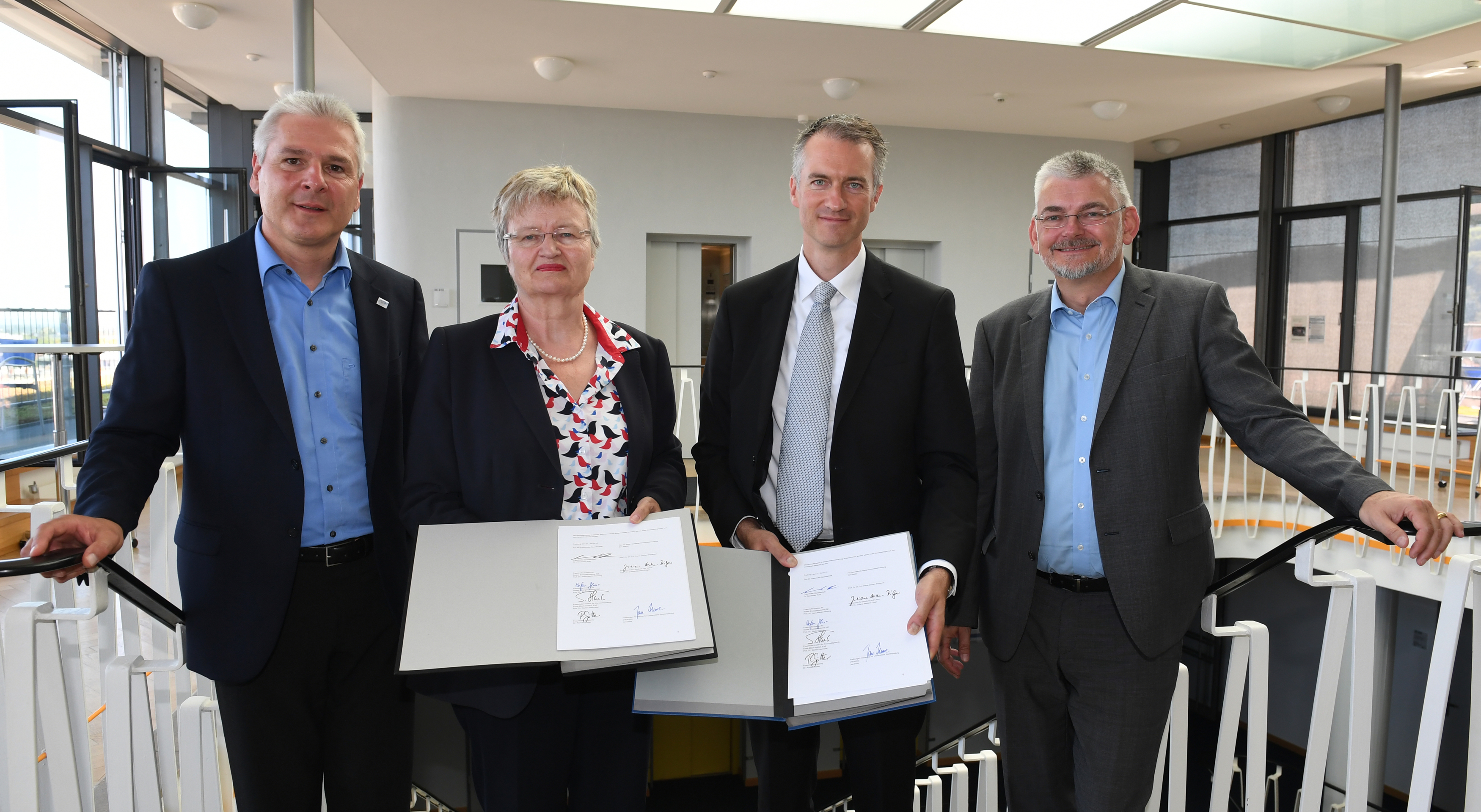 Von links: Jan Ihwe, Geschäftsführer der Freiburger Akademie für Universitäre Weiterbildung, Prof. Dr. Juliane Besters-Dilger, Prorektorin für Studium und Lehre der Universität Freiburg, Dr. Alexander Roth, Direktor Technologiemarketing der Fraunhofer-Gesellschaft, und Dr. Roman Götter, Leiter der Fraunhofer Academy, bei der Vertragsunterzeichnung.