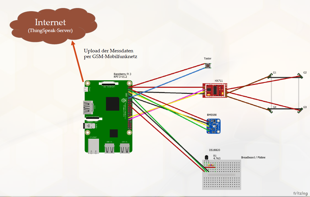 Die Studierenden Javan Rasokat (Hobbyimker), Melissa Spinuzza, Kevin Lauff und Max Freisler haben unter Leitung des Lehrbeauftragten Dennis Schulmeister-Zimolong im Rahmen ihres Projekts "HoneyPi" eine smarte Bienenstockwaage entwickelt. HoneyPi ist ein auf dem Raspberry Pi basiertes Messsystem. Es werden die Werte von Sensoren wie Temperatur, Luftfeuchtigkeit, Luftdruck und Gewicht gemessen. Dazu gehört eine App in der die Messdaten visualisiert werden. Diese Messwerte sind für einen Imker von besonderer Relevanz, um das Bienenvolk überwachen zu können. Der Imker bekommt die Möglichkeit, die Werte von überall abzurufen. Mögliche Einsatzszenarien sind beispielsweise das Erkennen eines ausfliegenden Bienenschwarms. Der Schwarmalarm wird durch einen Gewichtsabfall ausgelöst und der Imker wird über eine E-Mail darüber benachrichtigt. Ebenfalls kann die Brutraumtemperatur überwacht werden. Damit kann beispielsweise festgestellt werden, ob der Bienenstock im Winter in der Wintertraube ausreichend warmgehalten wird und das Bienenvolk noch Brut besitzt.