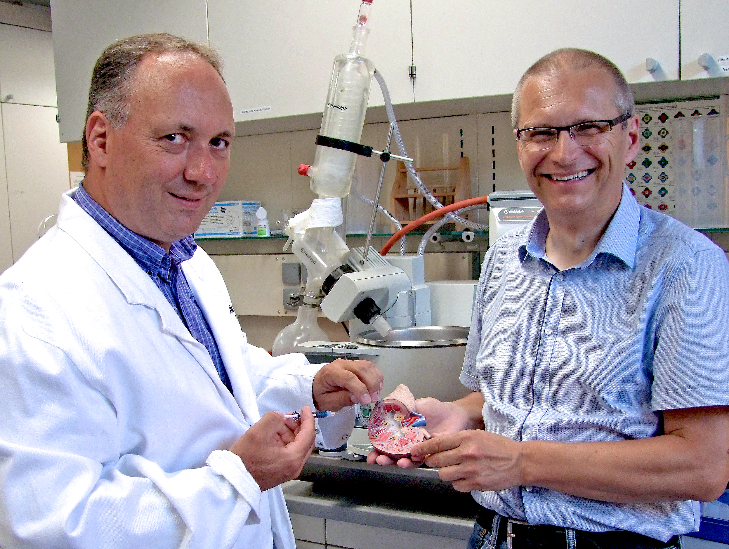 »Der Vorteil des medizinischen Klebstoffes liegt darin, dass die Klebstoffapplikation ohne neues Instrumentarium oder zusätzliche komplizierte Verfahrensschritte in bisherige endoskopische Operationsverfahren integriert werden kann. Nach dem Entfernen der großen Nierensteine werden die verbleibenden Restfragmente mit dem »mediNiK«-Klebstoff verklebt, welcher mit dem Endoskop während der Operation über die Harnwege zugeführt wird. Das Klebstoff-Steinfragment-Konglomerat wird hierdurch so groß, dass dieses problemlos mit den üblichen Fanginstrumenten entfernt werden kann«, beschreibt Manfred Peschka das neuartige Verfahren. »Aber das eigentliche Know-how steckt in der Entwicklung des Klebstoffes selbst: Der Klebstoff weist eine selektive Adhäsion auf und haftet weder an den verwendeten medizinischen Instrumenten noch an dem Nierengewebe, sondern verklebt nur die Steinfragmente. Das polymerisierte und elastische Klebstoffgel ist über die Endoskop-Kamera sehr gut sichtbar und gibt hierdurch dem behandelnden Urologen Hinweise auf mögliche Klebstoffreste«, erklärt Peschka den Fortschritt für die Medizintechnik.